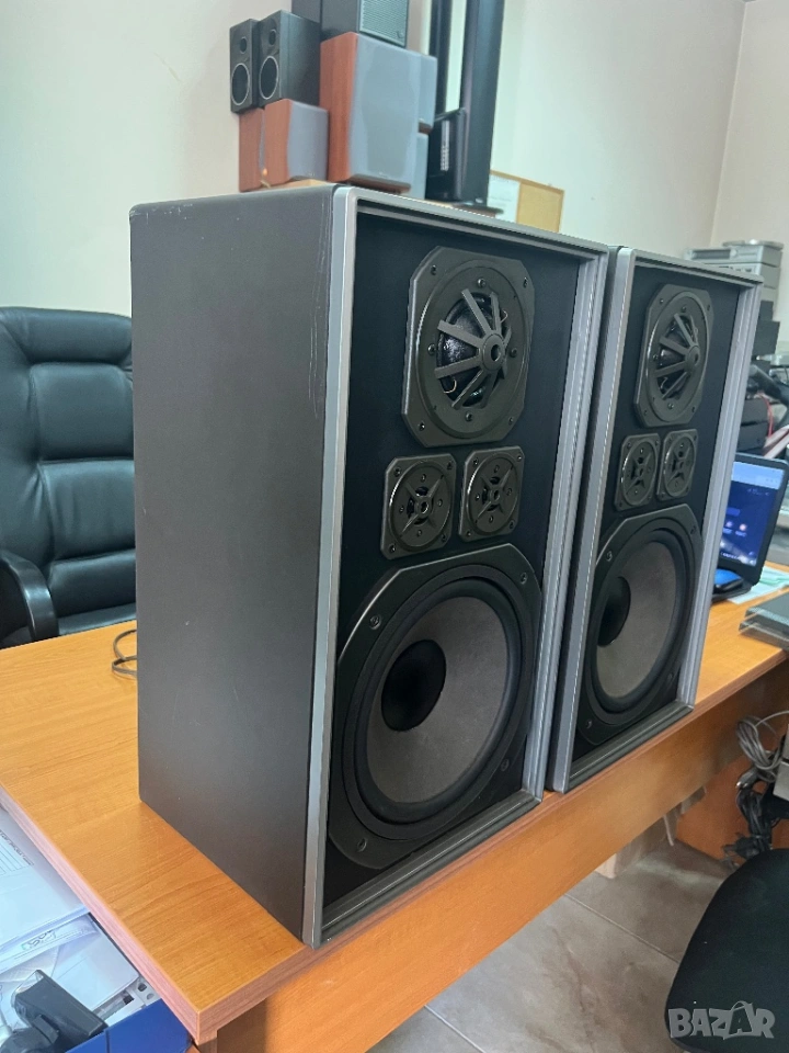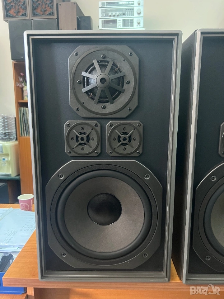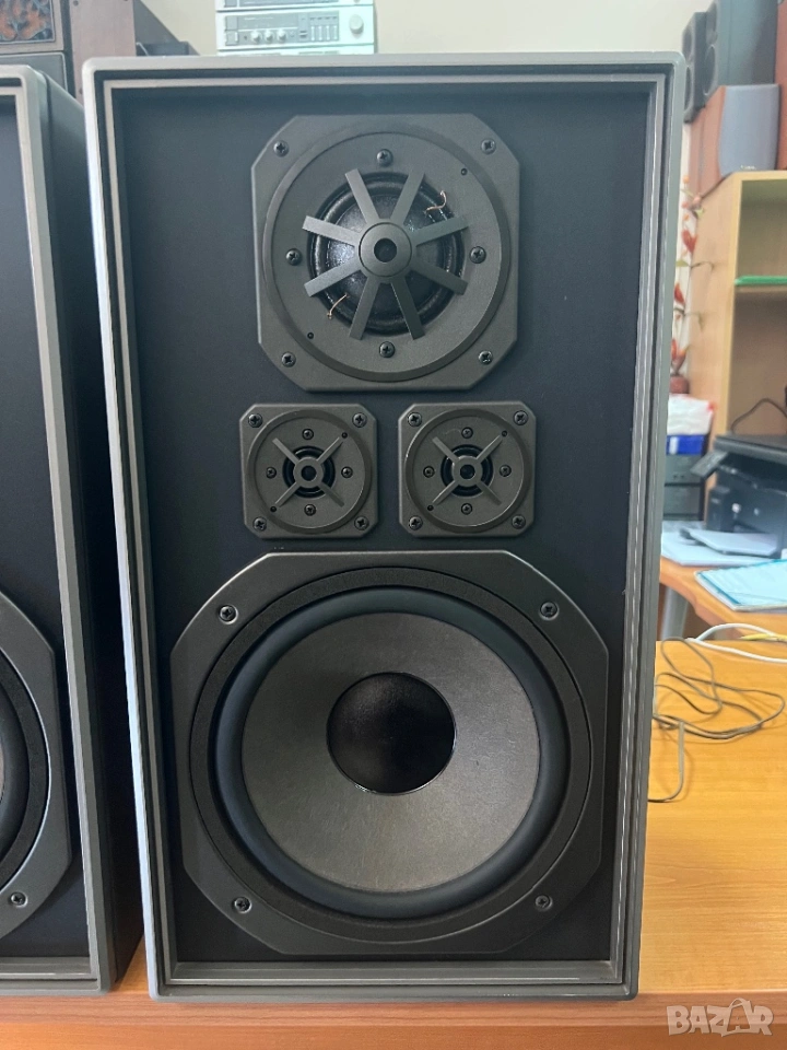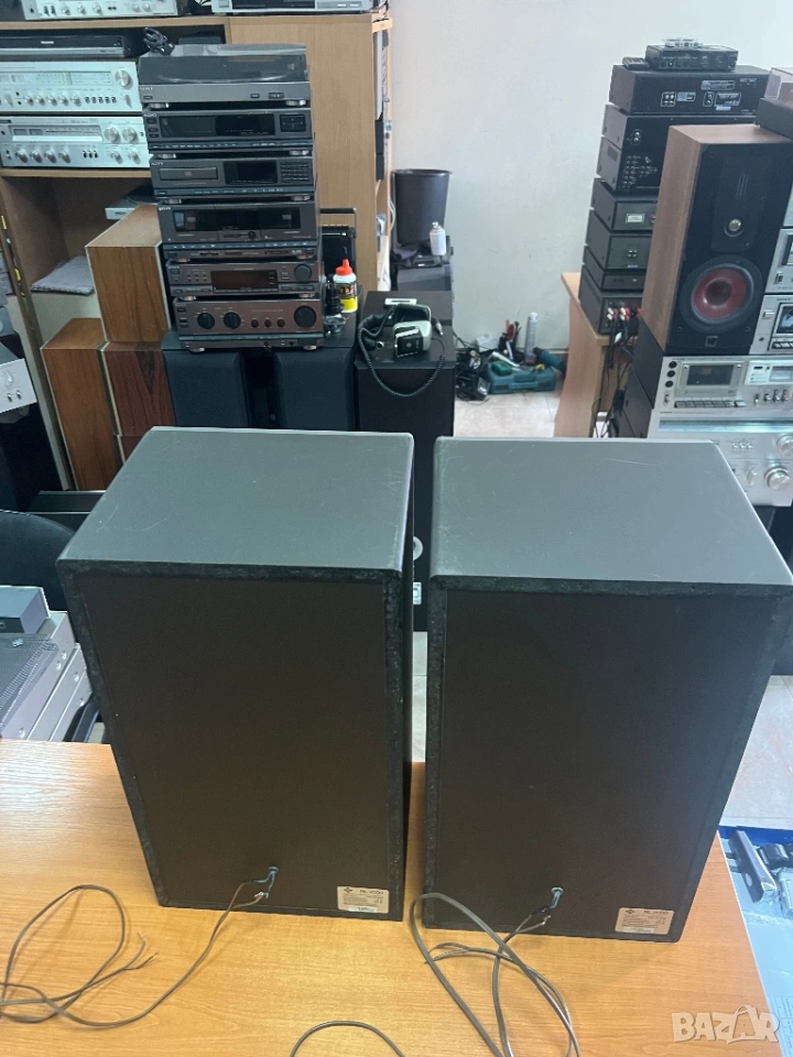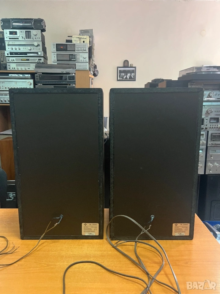 Telefunken RL 2000. Тип: Трилентови тонколони със затворен обем. Мощност: 120 W номинална / 200 W музикална. Импеданс: \(4\Omega \). Честотен диапазон: \(25\text{\ Hz}-25\,000\text{\ Hz}\). Размери и тегло: \(55\times 31\times 27.5\text{\ см}\), общо тегло около 30 кг.