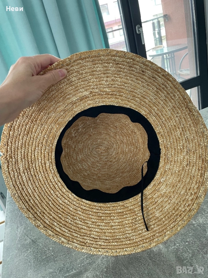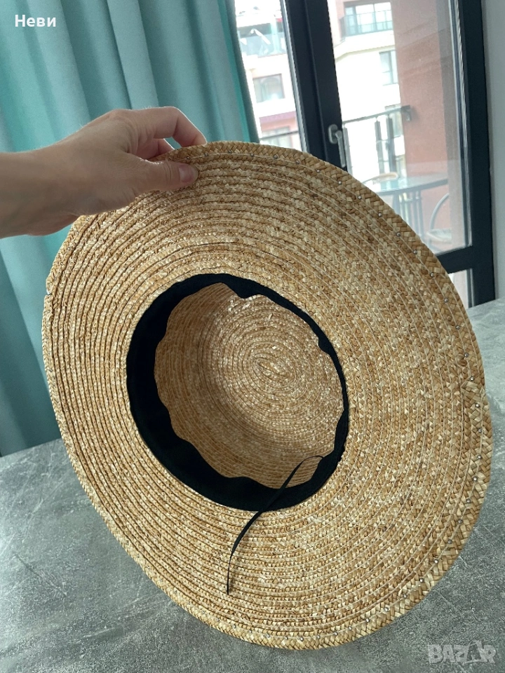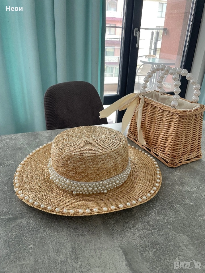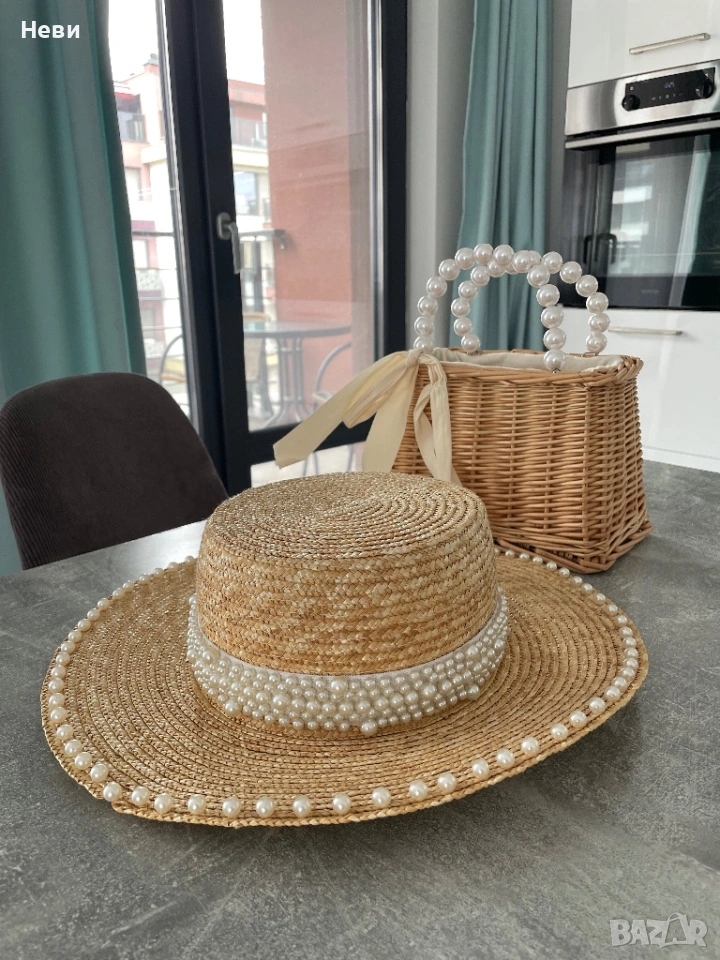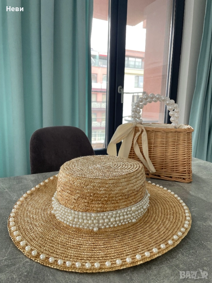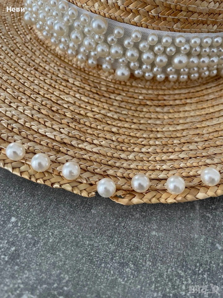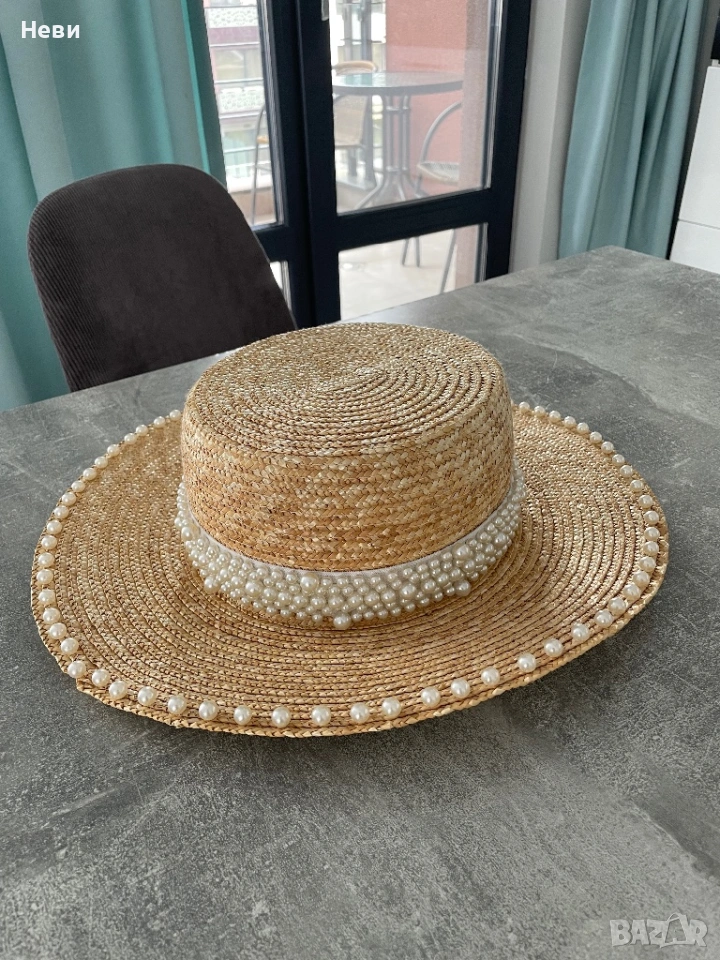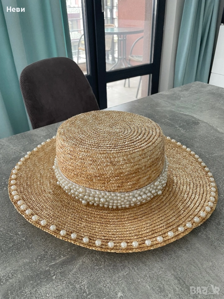 Сламена дамска шапка с декорация от перли → Обява 54172456
