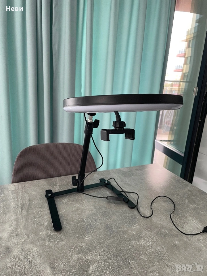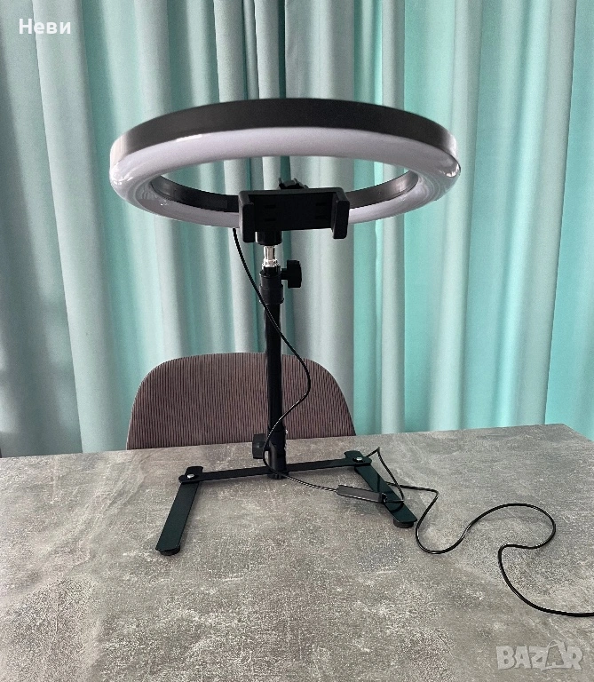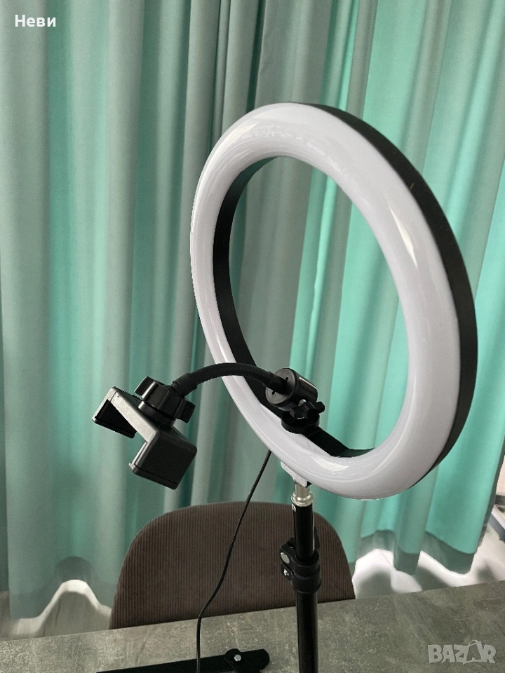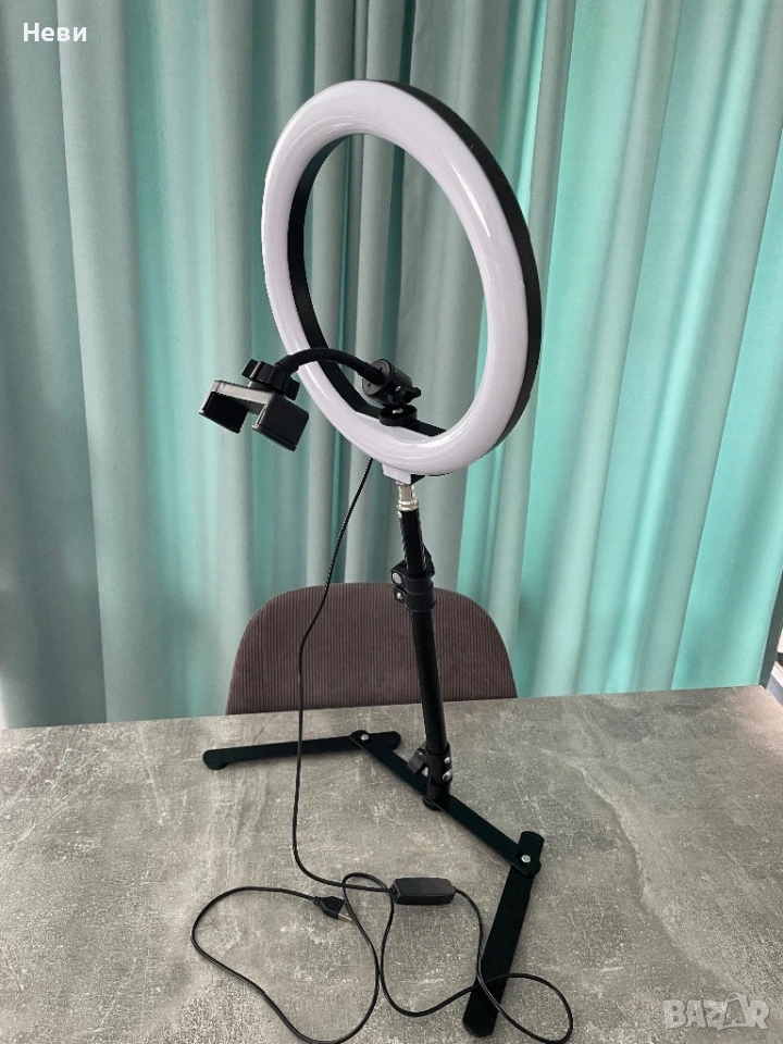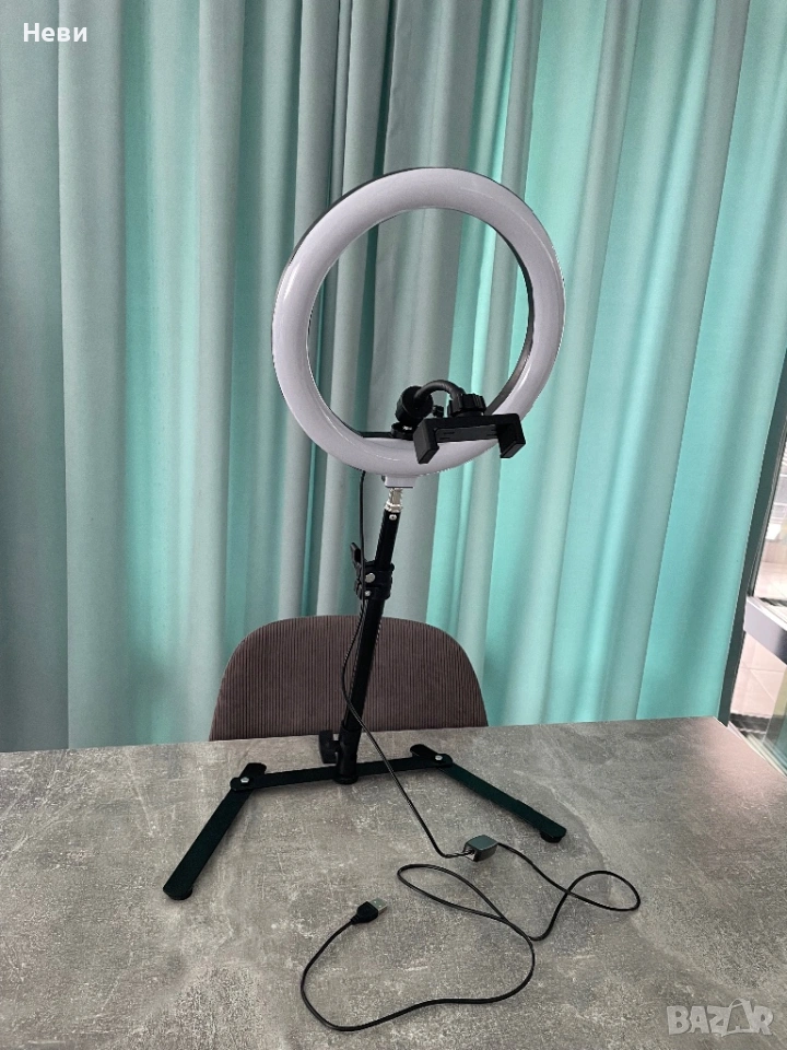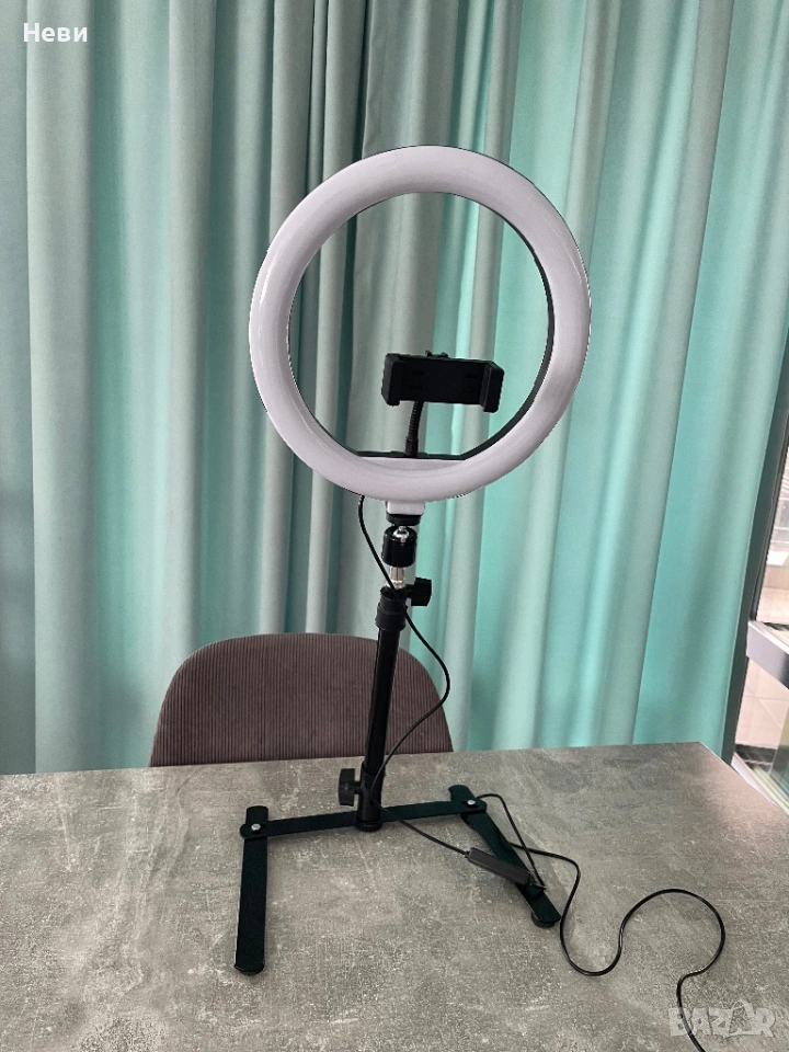 Продавам LED ринг лампа с поставка за телефон, подходяща за снимки, видеа, TikTok и лайв стрийминг. Поръчана е за продуктова фотография на дрехи, но не е подходяща, защото при заснемане на дрехи се виждат и краката на стойката. Ще бъде подходяща за продуктова фотография на малки предмети.