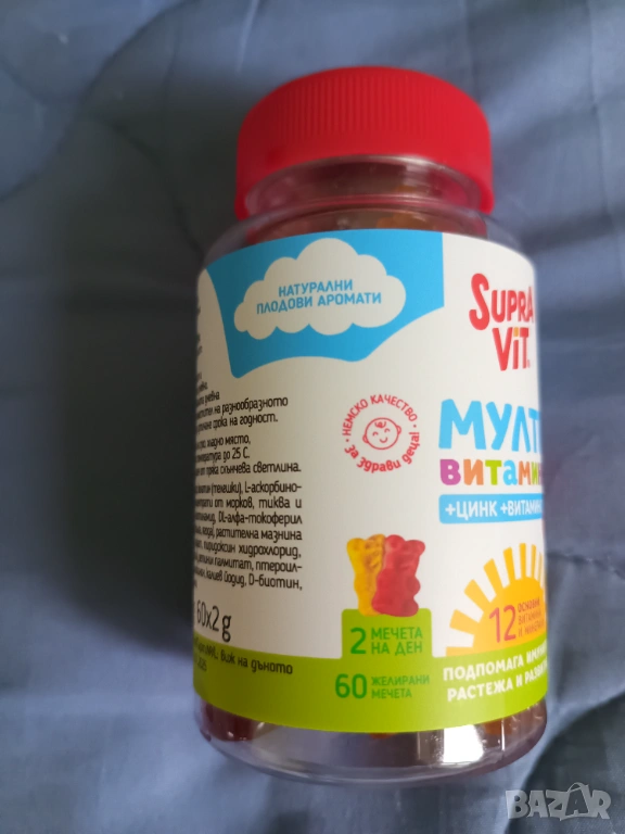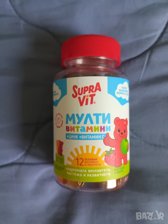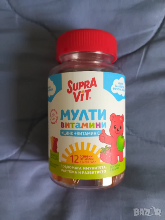 Мултивитамини за деца под формата на желирани мечета Supravit. Съдържат 12 основни витамина и минерала, които подпомагат имунитета, растежа и развитието на децата.