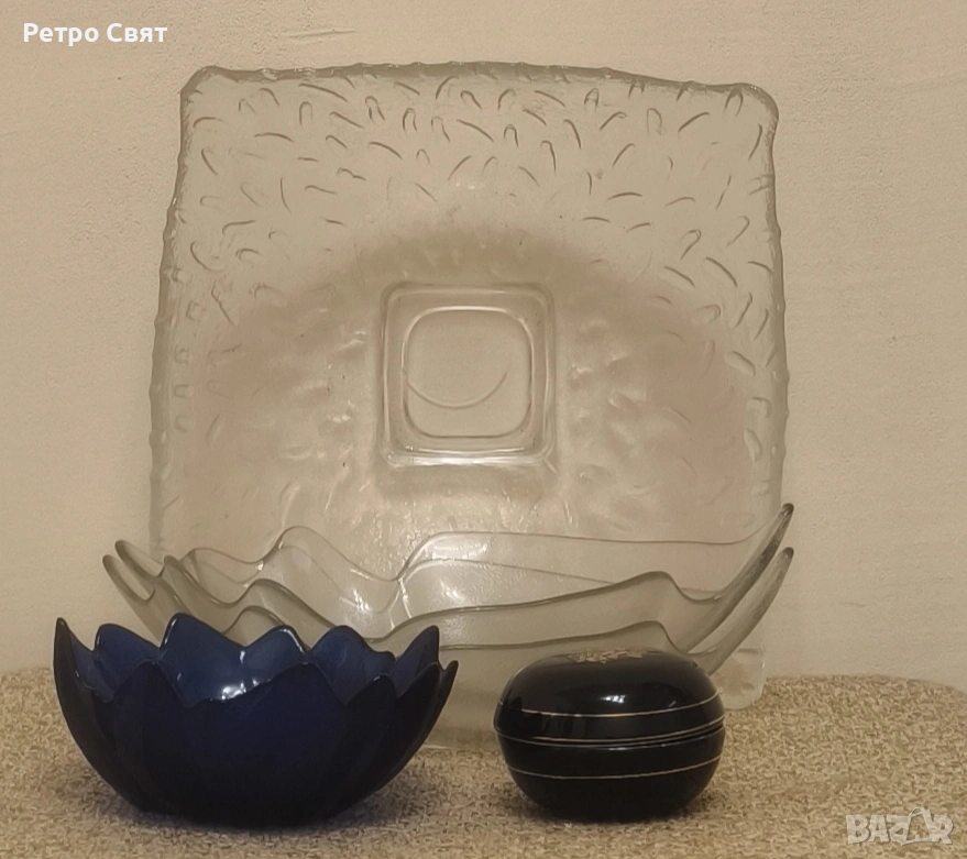 Голяма стъклена фруктиера, два съда за ядки във формата на лист, малък стъклен съд подходящ за чаена свещ и малка порцеланова кутийка. Всички предмети от снимката са напълно здрави и използваеми. Всичко от снимката за 10.00 €, предметите не се делят. Изпращам с куриер по избор, опаковам за моя сметка.