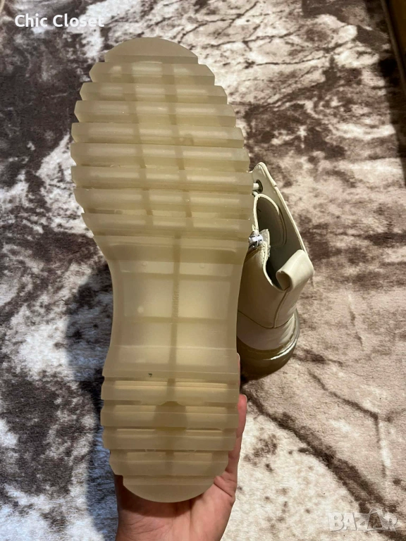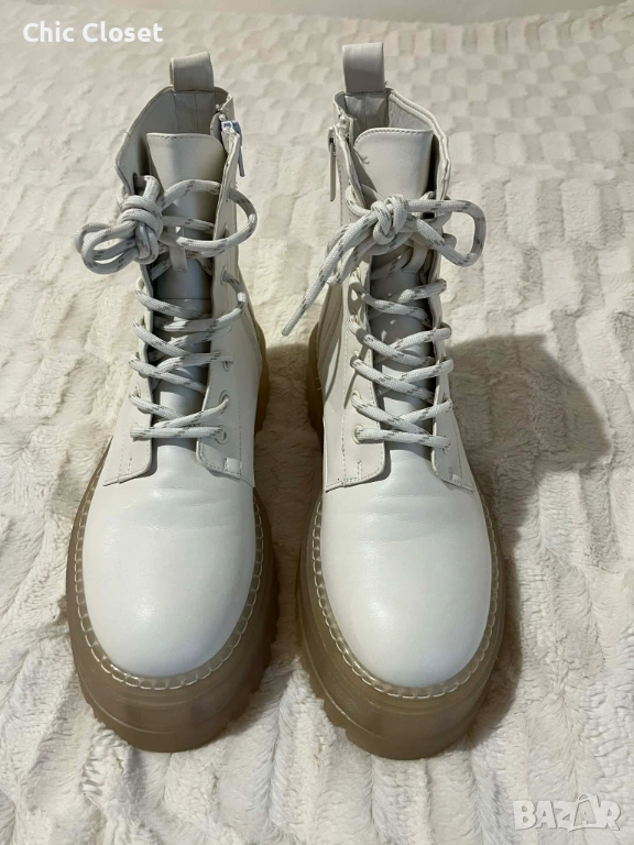 Чисто нови боти от Bershka в бял цвят, кожени. Никога не са носени. При купуването единия цип беше скъсан и е сменян и е различен от другия. Подметката е с височина 4/5 сантиметра. Стелката е 26 см. Номер 40. Нямат кутия.