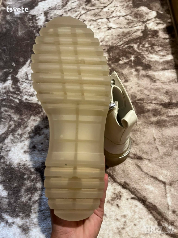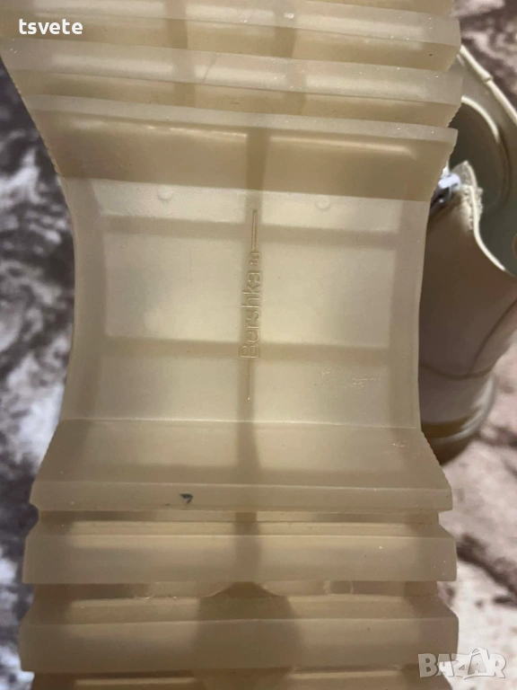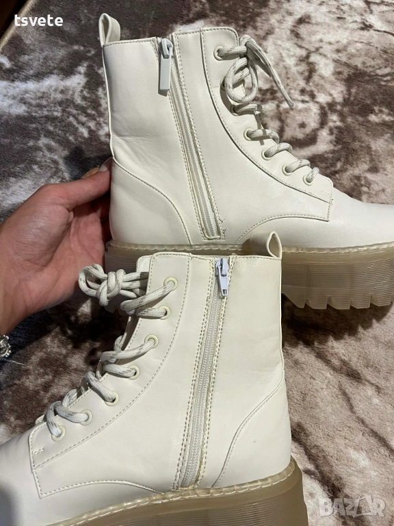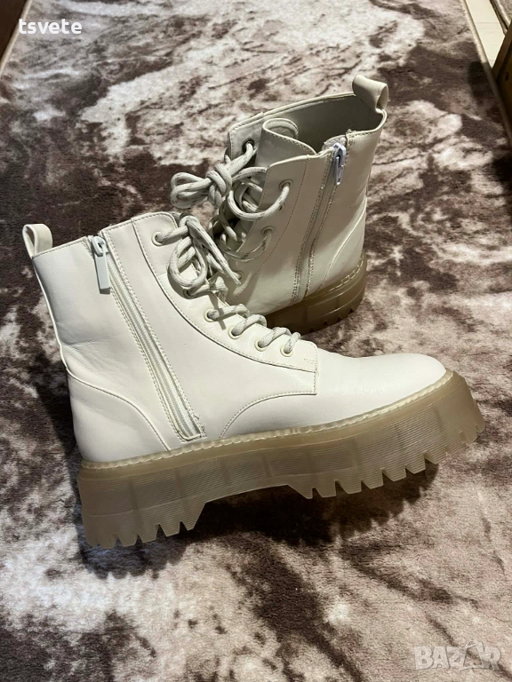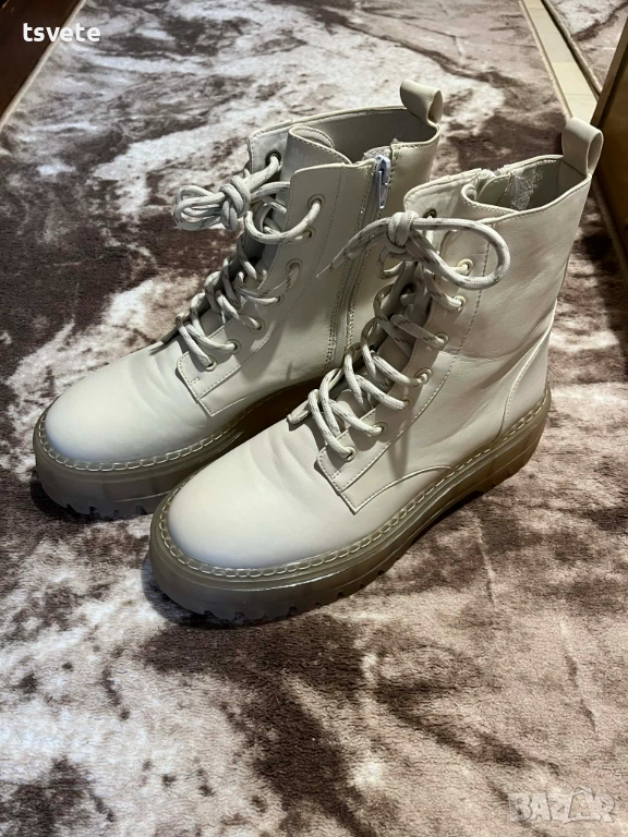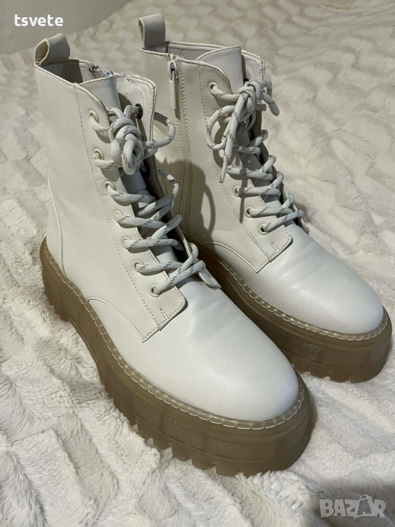 Чисто нови боти от Bershka в бял цвят, кожени. Никога не са носени. При купуването единия цип беше скъсан и е сменян и е различен от другия. Подметката е с височина 4/5 сантиметра. Стелката е 26 см. Номер 40. Нямат кутия..