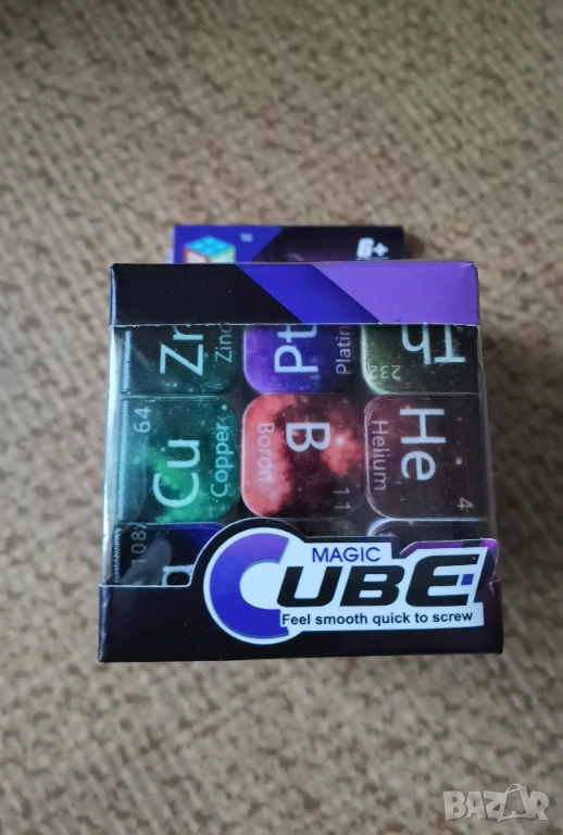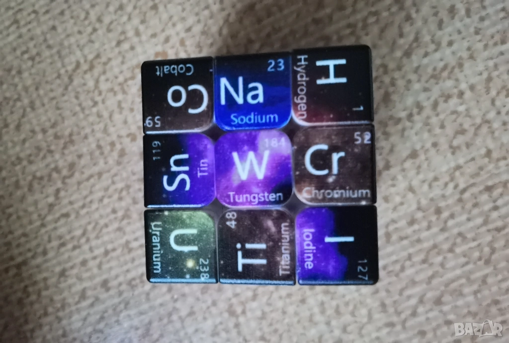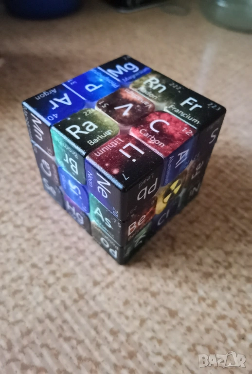 2. Класическо кубче на Рубик 3x3x3, но е с наименования, числа от периодичната таблица и букви на различни химични елементи. Кубчето е ново, не е ползвано, но е отваряна кутията, за да проверя състоянието му и да го разгледам. Цена 4 евро