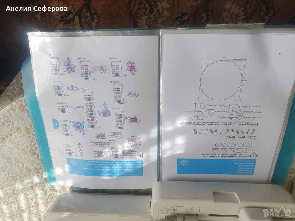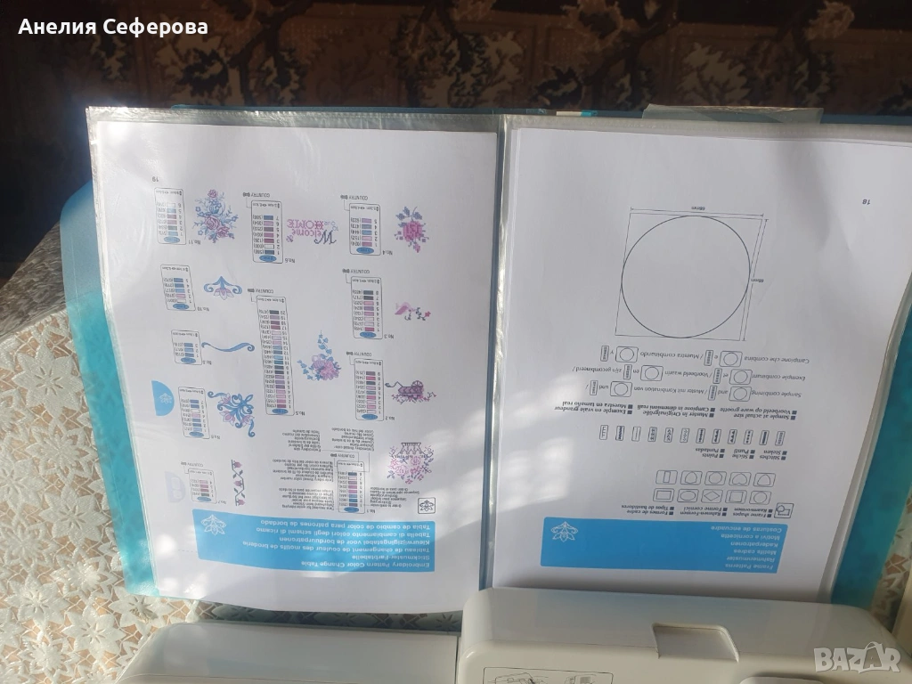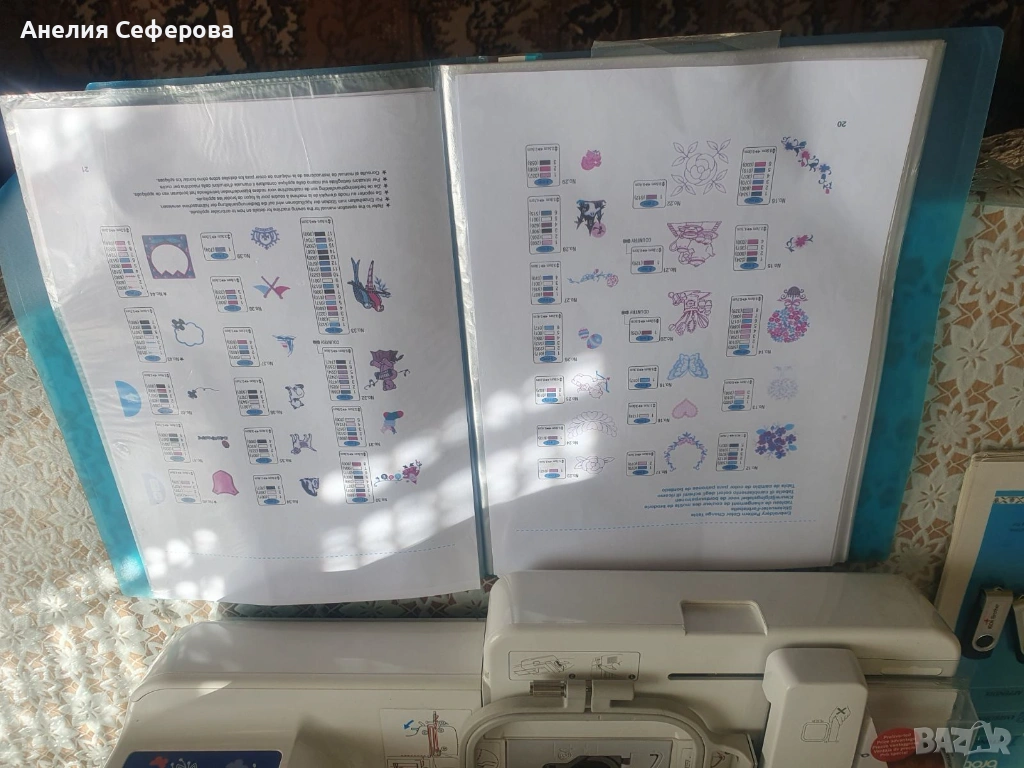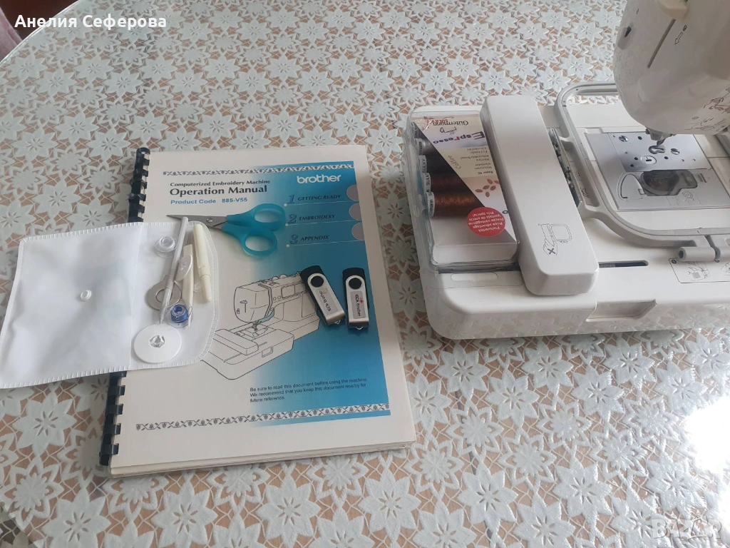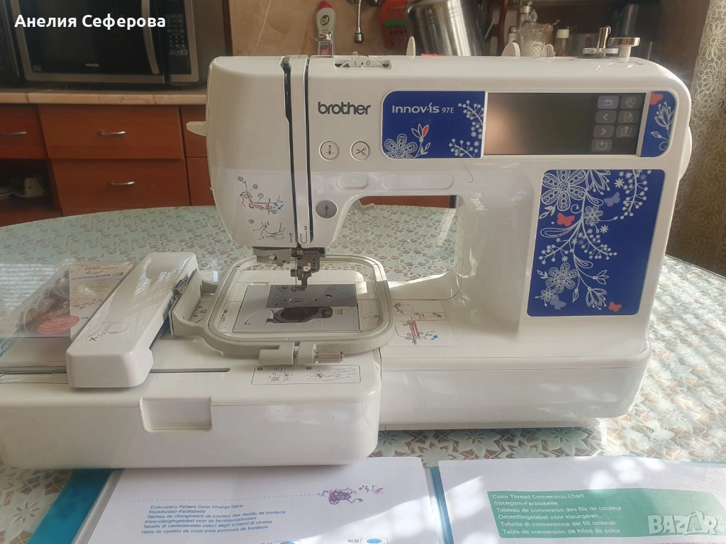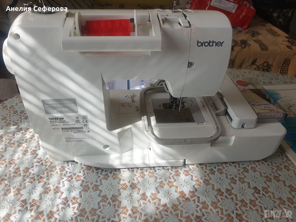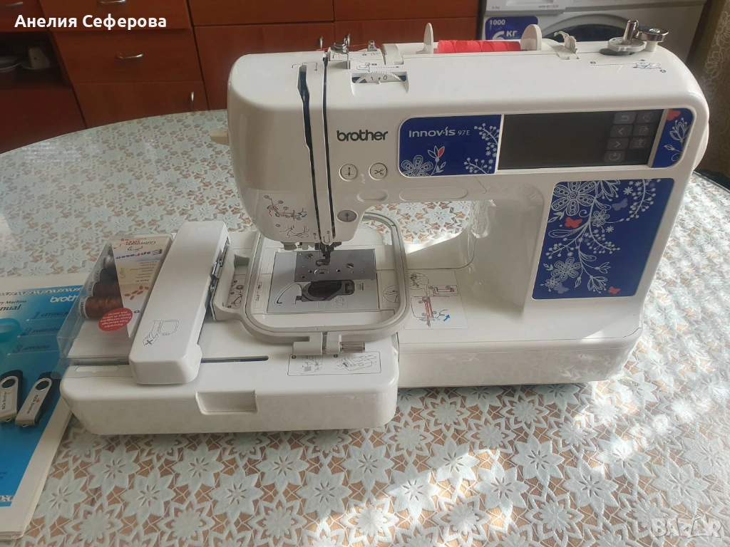 Brother Innov-is 97E. Това е компютъризиран модел, предназначен специално за бродерия, който е подходящ както за начинаещи, така и за напреднали потребители поради своята лесна употреба и компактен размер. Разполага с площ за бродиране от 100 x 100 мм.Машината идва със 70 вградени мотива за бродерия и две флашки със допълнителни бродерии.Има USB порт, който позволява лесно прехвърляне на допълнителни дизайни от компютър чрез флаш памет.Снабдена е със задно осветен LCD сензорен екран, чрез който можете да избирате и редактирате дизайните директно върху машината.Включва функции като автоматично вдяване на иглата, сензор за долния конец и система за бързо поставяне на калерчето. Използвана е само няколко пъти.