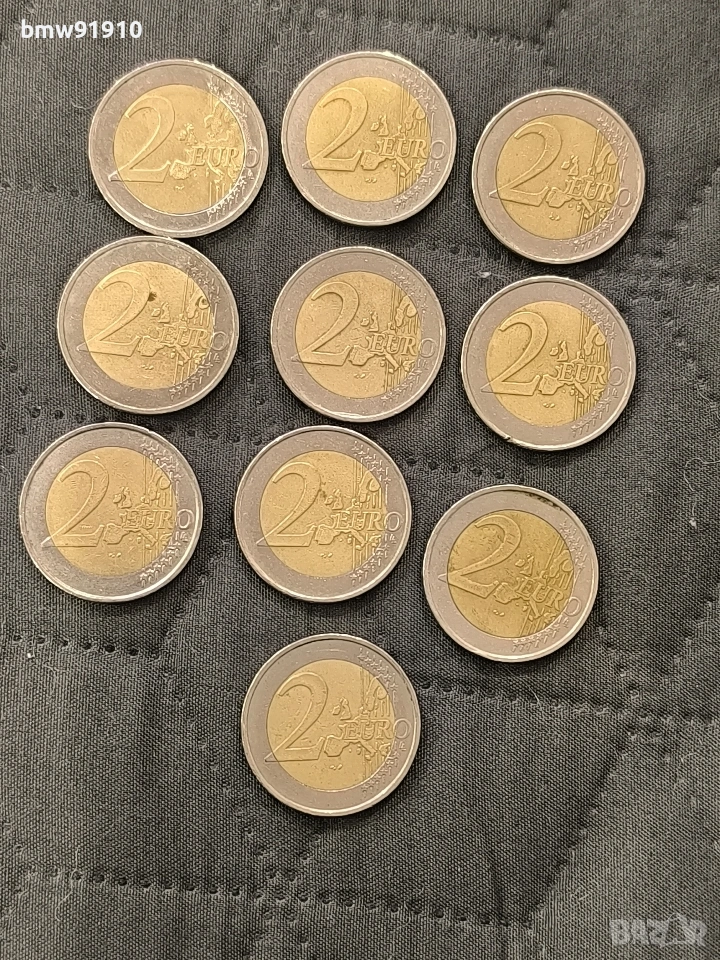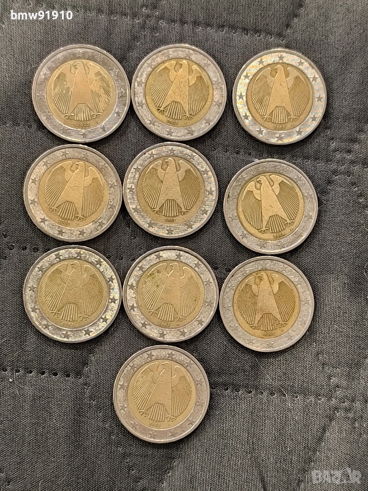 Продавам 10 броя 2 евро с букви: 3 броя 2002 с буква А, 2 броя 2002 с буква J , 2 броя 2002 с буква F. 1 бр 2003 с буква D , 1 бр 2004 с буква J , 1 бр 2023 с буква G.