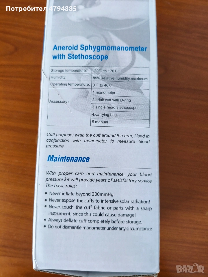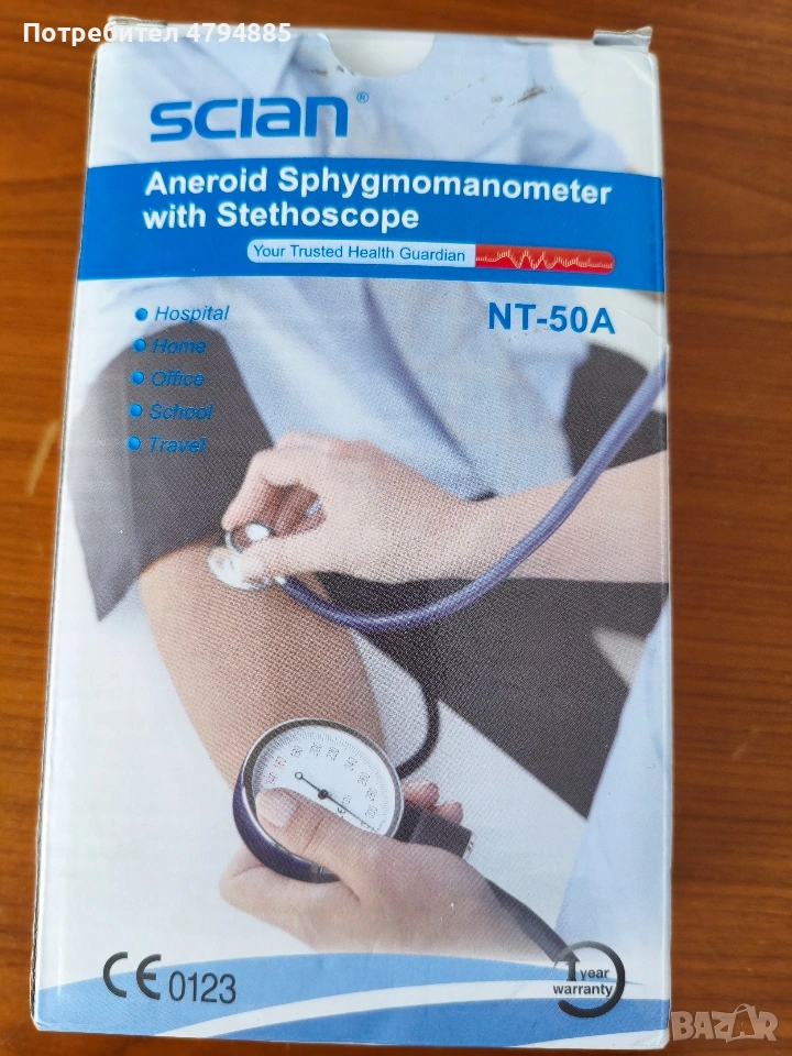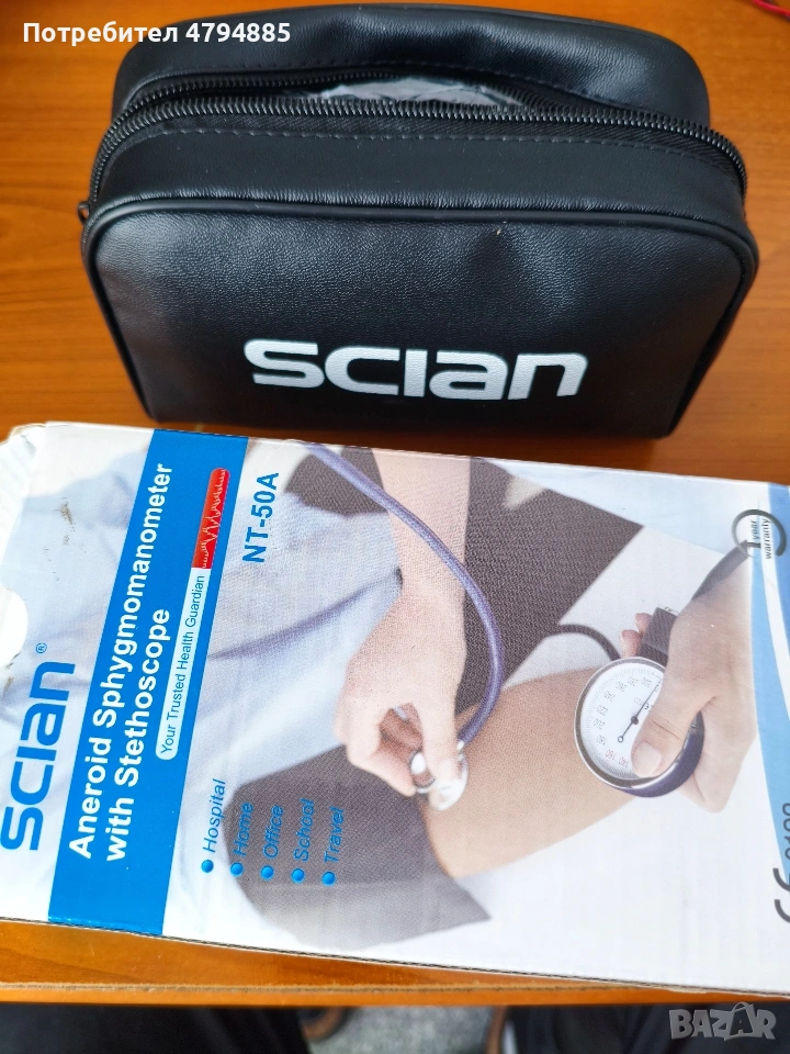 Нов,неупотребяван.Това е анероиден сфигмоманометър (ръчен апарат за измерване на кръвно налягане) със стетоскоп на марката Scian, модел NT-50A. Тип: Ръчен апарат с механичен манометър и стетоскоп за измерване на кръвното налягане на горната част на ръката. Характеристики: Включва маншет с D-образен пръстен за лесно поставяне с една ръка и високоточен манометър. Приложение: Подходящ за домашна употреба, болници, офиси и пътуване. Сертификация: CE сертифициран медицински продукт.