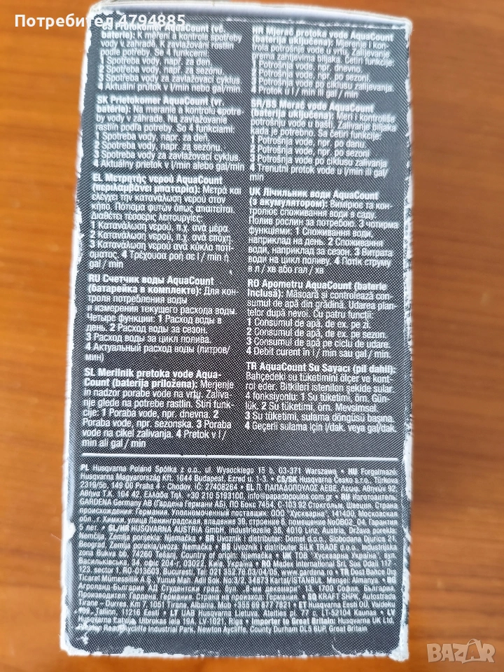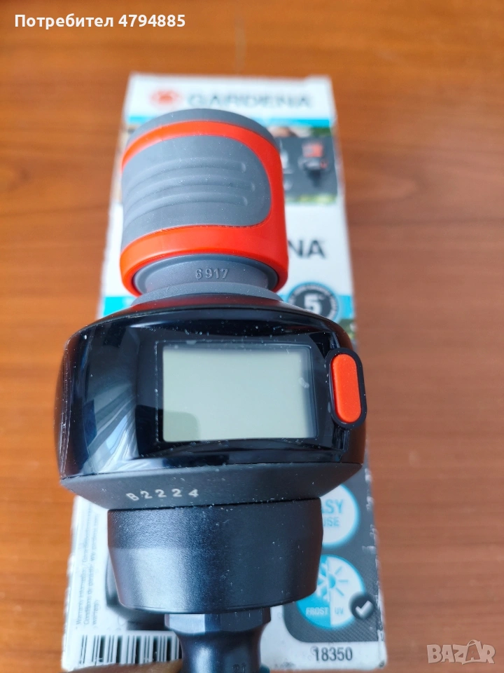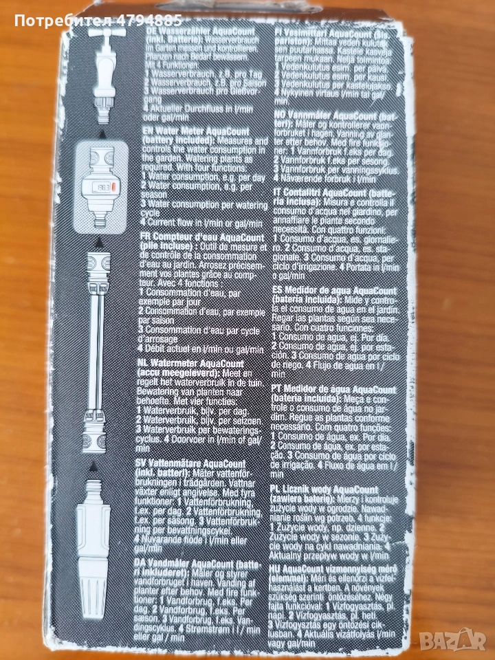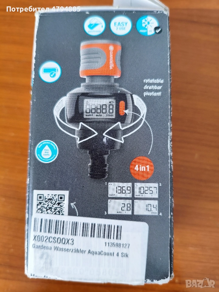 Този продукт е електронен водомер Gardena AquaCount (модел 18350-20), предназначен за проследяване на консумацията на вода в градината.
