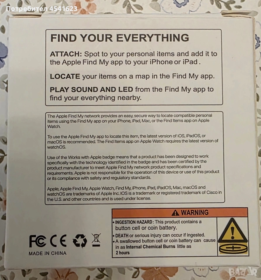 Функции: Позволява локализиране на изгубени вещи на карта, издава звуков сигнал за намиране наблизо и има функция за известяване при отдалечаване.