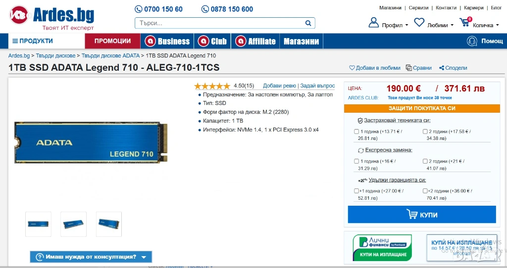 2. Adata Legend 710 с обем 1 TB /1000 GB/ PCIe Gen3 x4 NVMe 1.4, M.2 2280 - гаранция 2 години