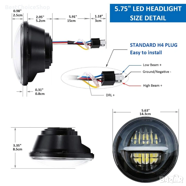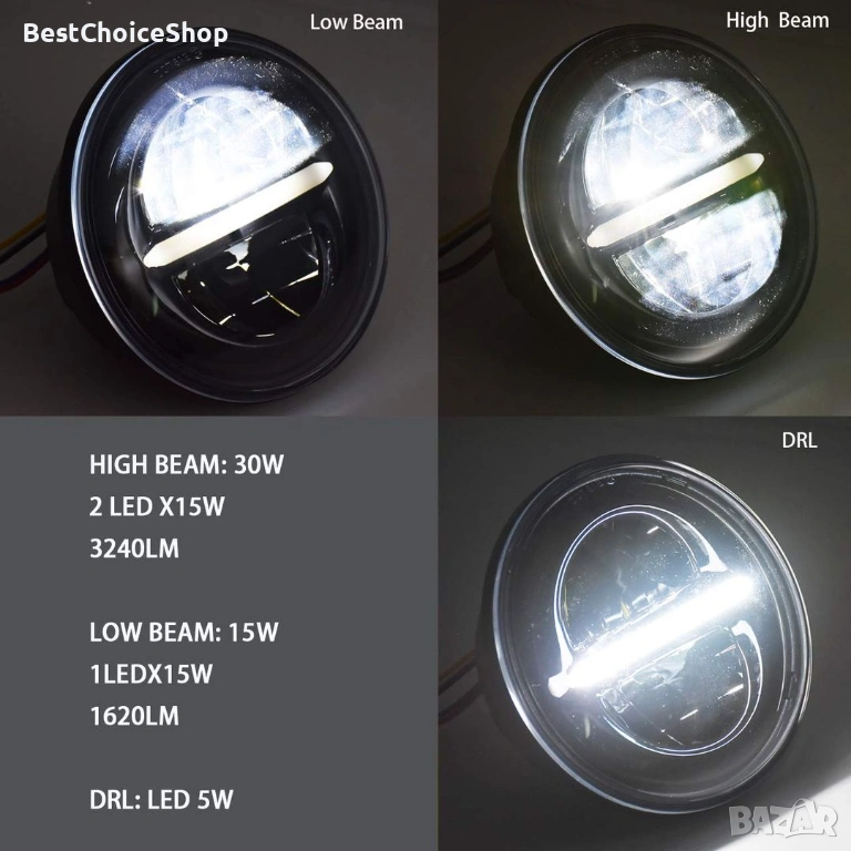 - Висока яркост: 5,75-инчовият LED фар предлага супер ярък, проникващ през нощта светлинен поток в сравнение с конвенционалните крушки с нажежаема жичка. Допустимото разстояние на излъчване за дълги/къси светлини е много по-дълго от това на OEM халогенните лампи. Дълги светлини 30 вата, 3240 лумена, къси светлини 15 вата, 1620 лумена, дневни светлини 5 вата. Цветна температура: 6500 K