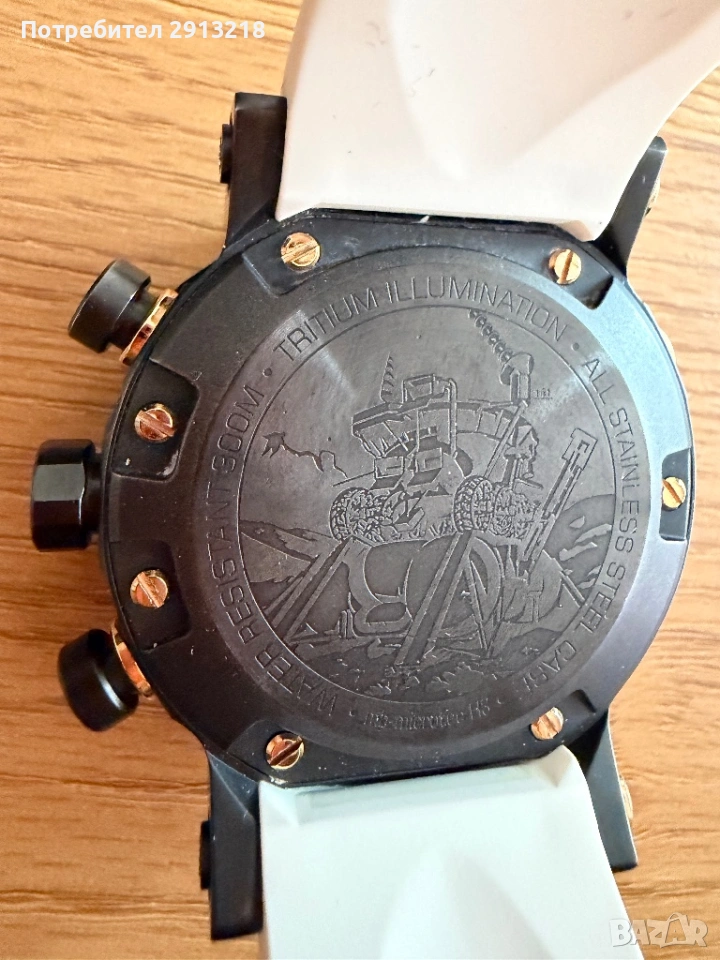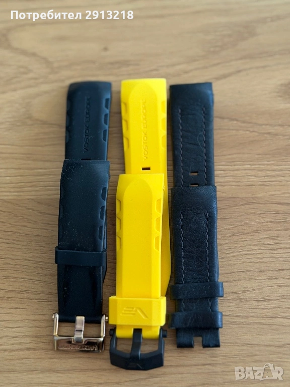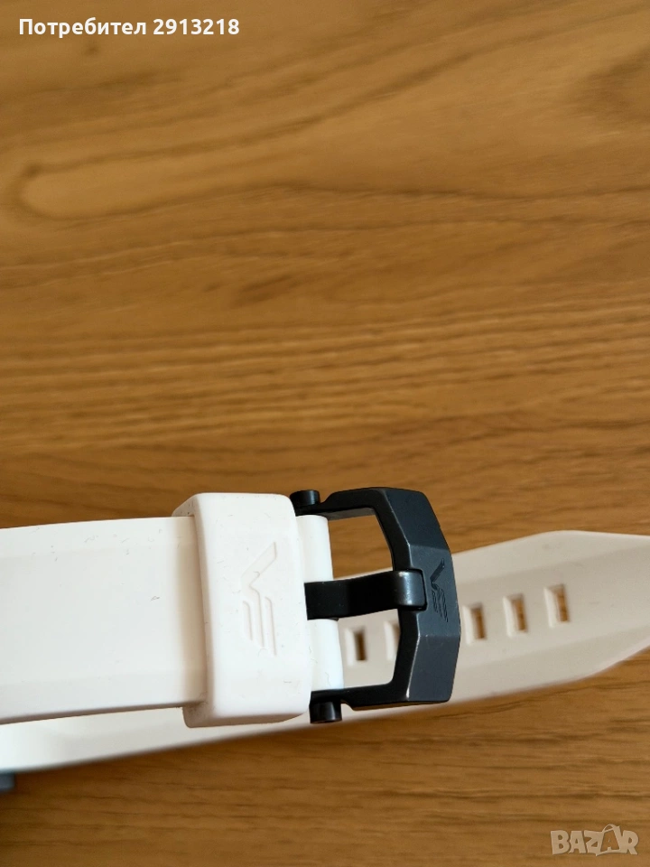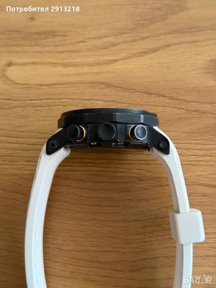 Часовникът е пълен комплект с 4 броя каишки черна кожена от естесвена кожа, черна силиконова, жълта силиконова и бяла силиконова. Всички каишки са оригинални за модела. Жълтата и Бяла са почти нови, носени са броени пъти всяка от тях е закупувана за 120лв броя.