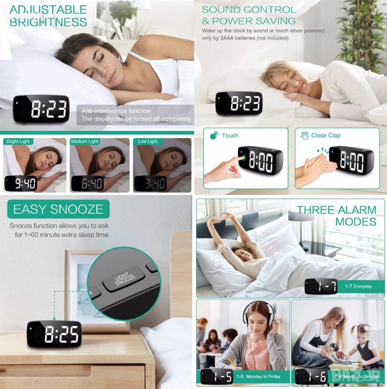 *Модерен дигитален будилник с два режима на работа.При работа на ток свети постоянно.При работа на батерии преминава в икономичен режим–активирате дисплея чрез почукване по бюрото или пляскане.Уникално и удобно за нощно ползване!
