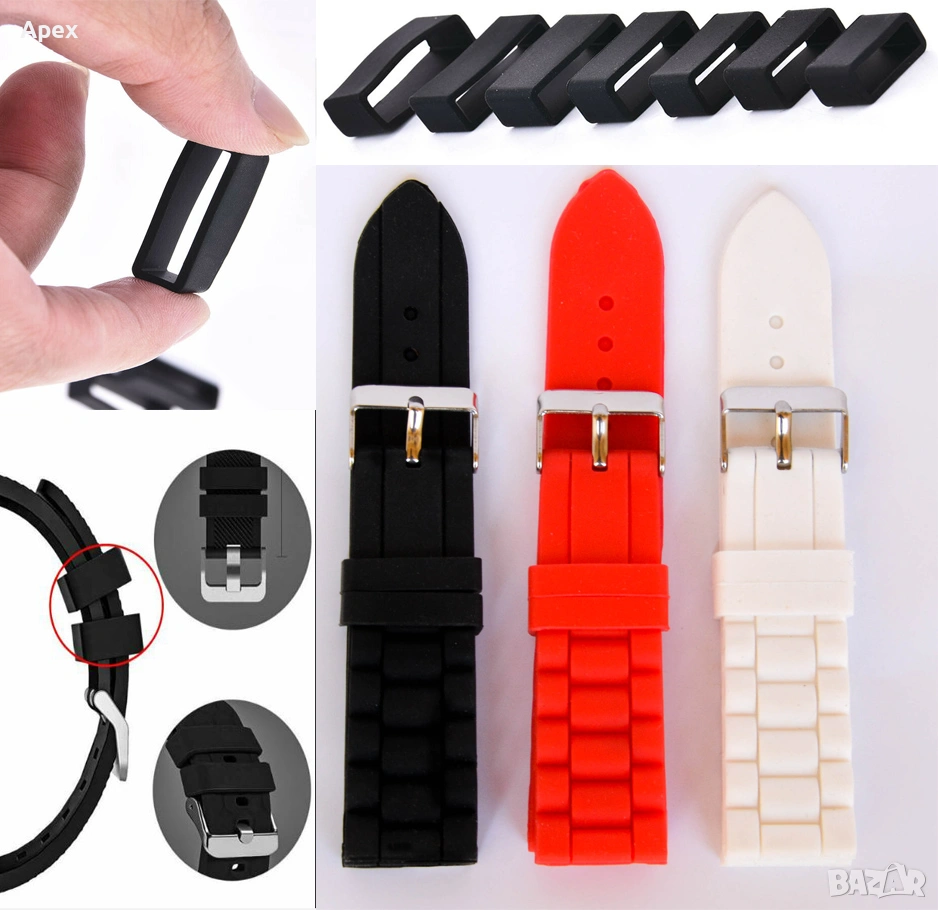 -ХАЛКИ И ГАЙКИ ЗА КАИШКИ: Силиконови и гумени държачи (стопери) които държат каишката прибрана. Налични за силиконови кожени. Елемент, който държи каишката прибрана след закопчаване. Аксесоари за ръчни часовници. Различни размери.