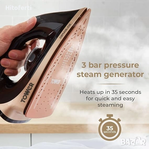 - ПАРОГЕНЕРАТОР С НАЛЯГАНЕ ОТ 3 БАРА: Добавя влага към тъканите, за да направи премахването на гънки и набръчкани без усилие, с бързо загряване за 35 секунди за бързо и лесно гладене с пара