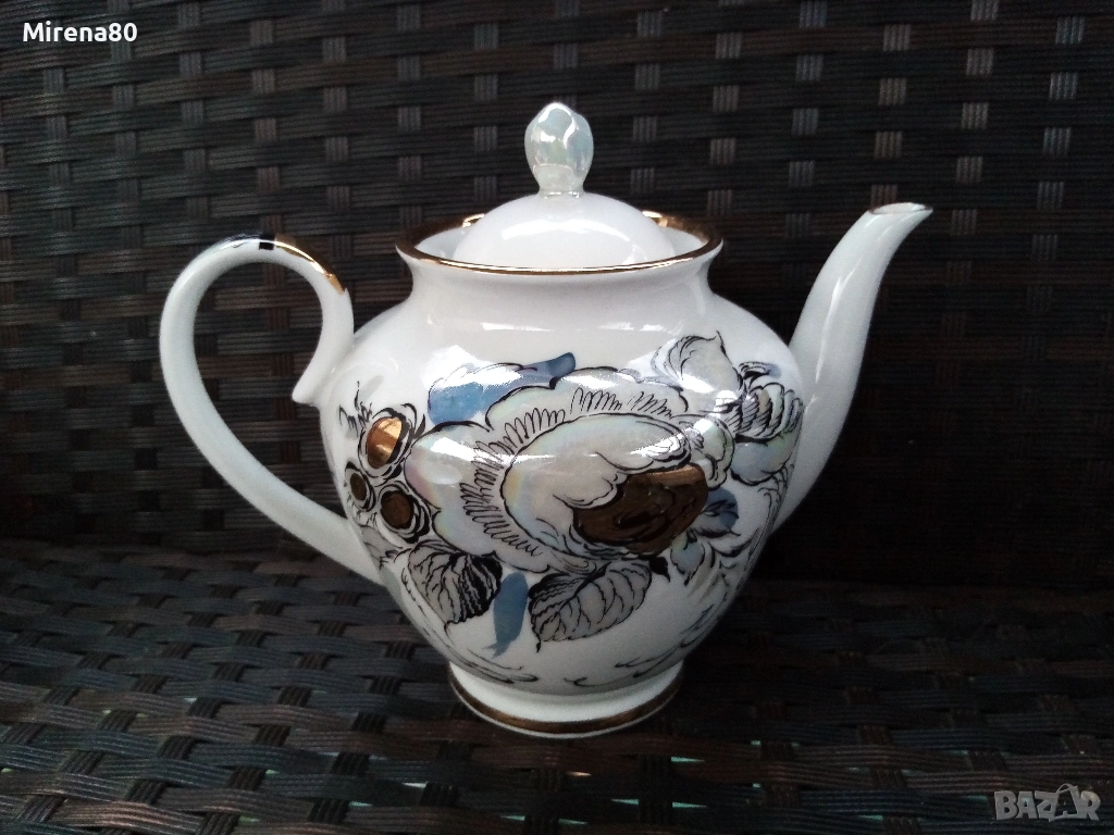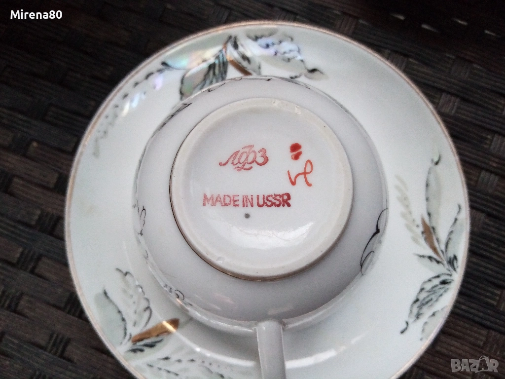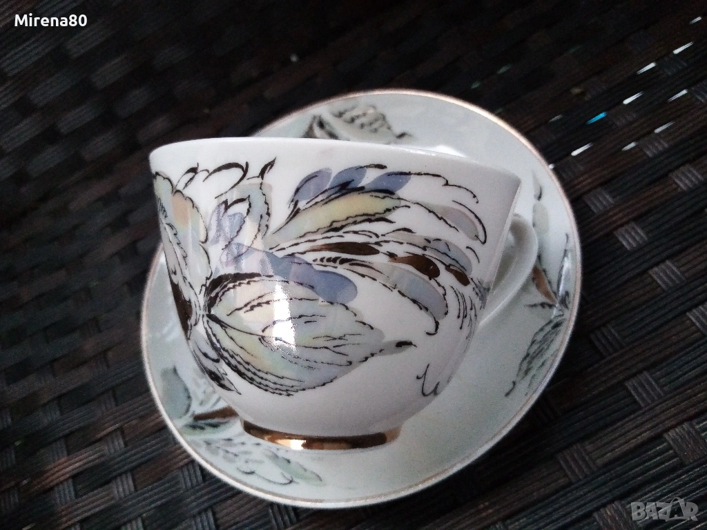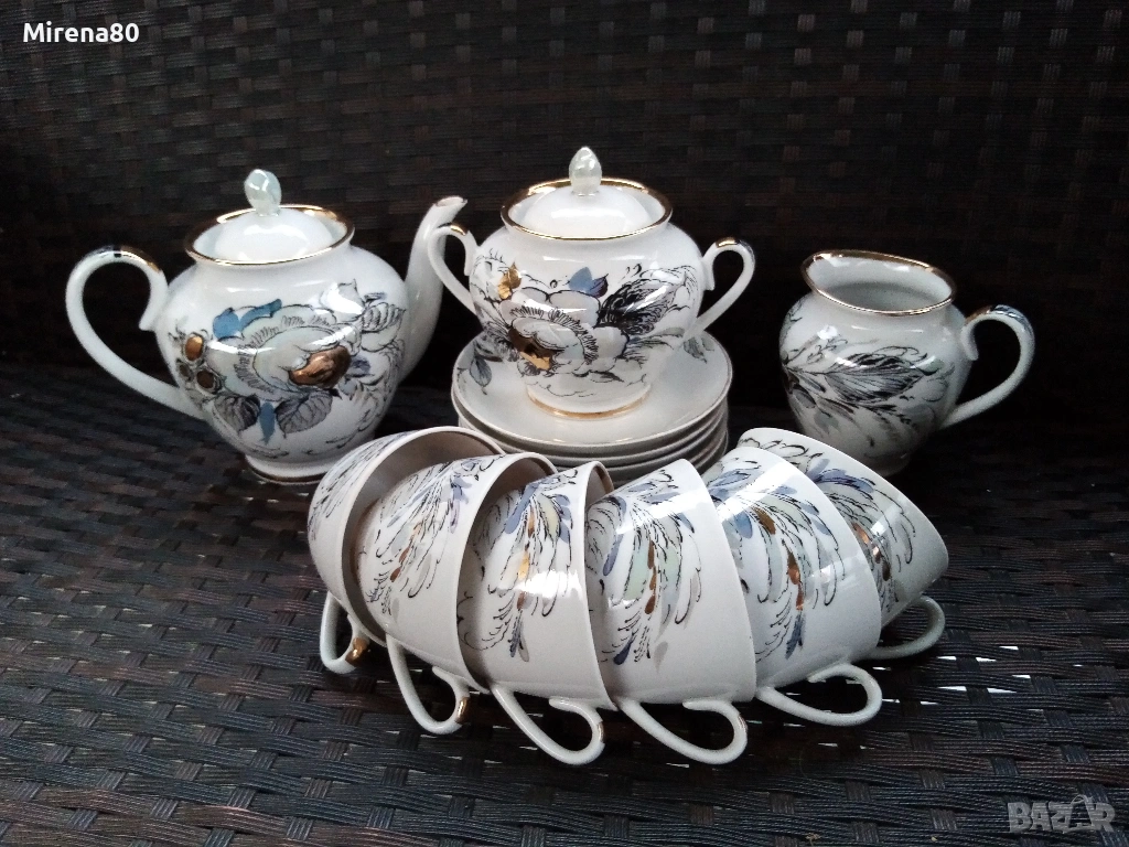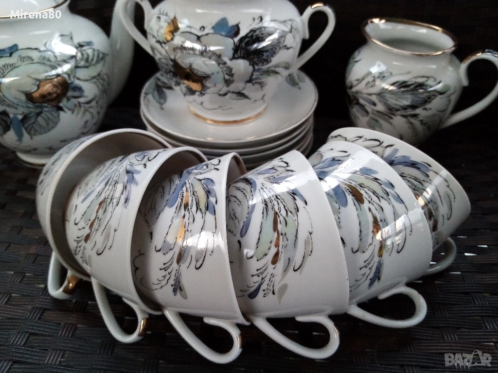 Производство около 1980 год. - СССР. Художник А.Н.Семёнова.Форма "Весенний", Автор на формата.С.Е.Яковлева. Страхотно преливане на цветове с перлен финиш. Напълно здрав и много красив, със следи от употреба единствено по позлатата на чинийките и някои чаши (снимани). Маркировка червен печат.
