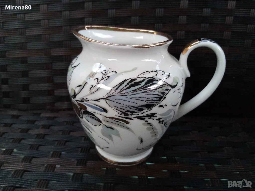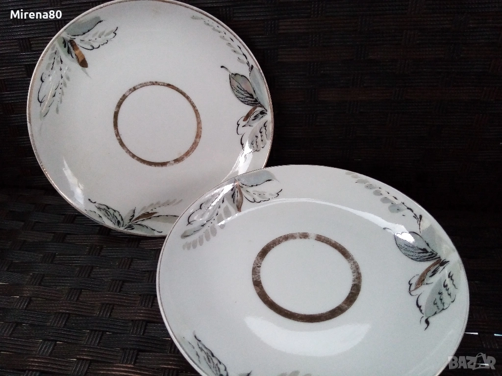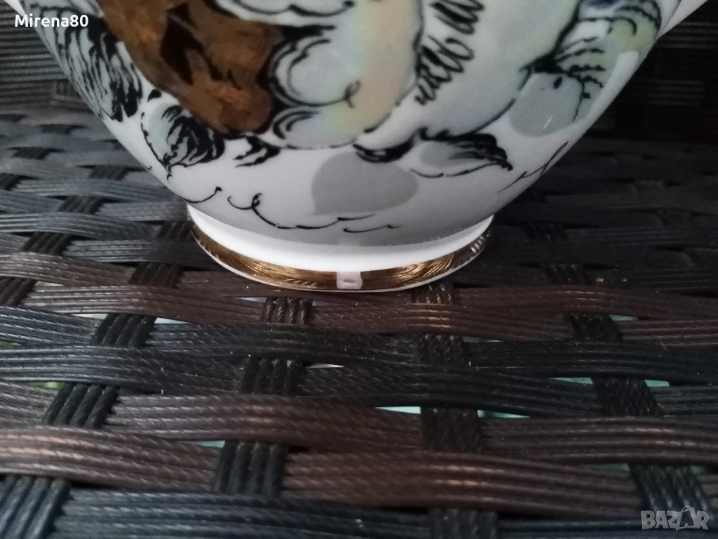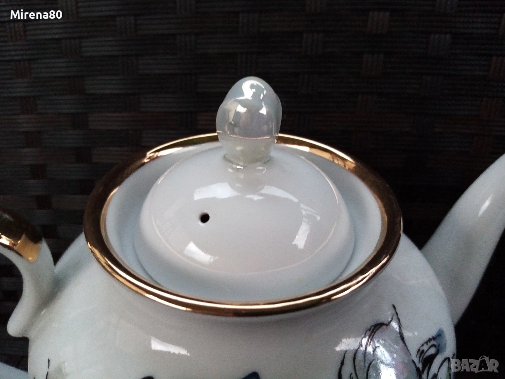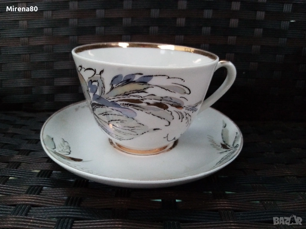 Производство около 1980 год. - СССР. Художник А.Н.Семёнова.Форма "Весенний", Автор на формата.С.Е.Яковлева. Страхотно преливане на цветове с перлен финиш. Напълно здрав и много красив, със следи от употреба единствено по позлатата на чинийките и някои чаши (снимани). Маркировка червен печат.