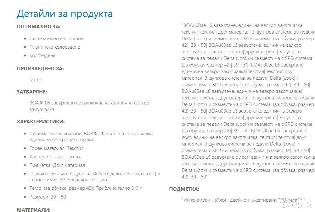 Универсалност: Подметката от инжектиран найлон и фибростъкло е съвместима с основните педални системи: Look/SPD-SL (шосе) и SPD (MTB).