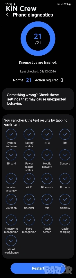 Телефонът е закупен в брой от Технополис, не е root-ван (Knox Guard 0x0) или ремонтиран, изключително запазен, с оригинален IMEI, съвпадащ с кутията и гаранционната карта, като е преминал диагностика със Samsung Members с резултат 21/21 теста.