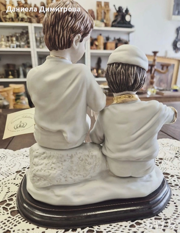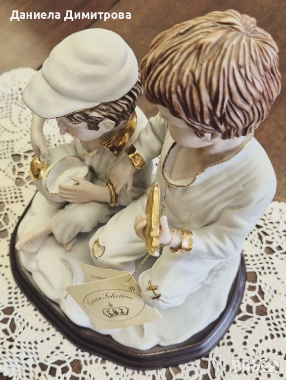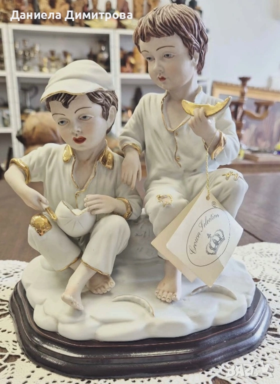 Колекционерска порцеланова композиция на две момчета върху дървен постамент с 24 каратова позлата. Дървото е в много тъмно кафяв цвят. Фигурата е от бисквитен / неглазиран порцелан, който придава на фигурите по-реалистичен вид. Тази порцеланова композиция от “Crown Selection” , изобразява две момчета вдъхновени от картината на Мурильо “Две момчета ядящи пъпеш и грозде”. Бедно облечени с малки кръпки по дрехите. Тази фигура улавя момент на искрено детско щастие и споделеност.