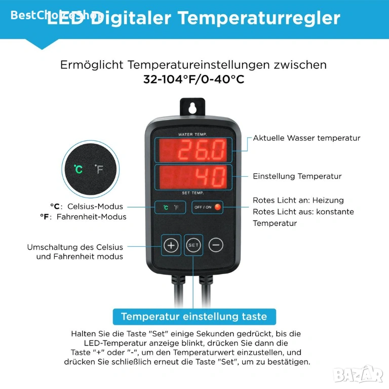 - [Външен LED контролер с индикатор] Регулируем температурен диапазон: 0°C-40°C/32°F-104°F. Фаренхайт и Целзий могат да се преобразуват една в друга. Двойният цифров дисплей ясно показва температурата на водата и зададената температура. Когато температурата на водата надвиши зададената температура, нагревателят автоматично ще спре нагряването и червеният индикатор за нагряване ще изгасне. Когато температурата на водата е с 1℃ под зададената температура, нагревателят ще се нагрее автоматично.