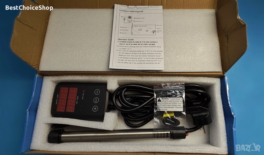 - [Предпазни мерки при употреба] Моля, обърнете внимание: Потопяемият нагревател за аквариум трябва да бъде изцяло потопен във вода, излагането на въздух може да доведе до загуба на контрол на температурата и не го заравяйте в пясък или кал. Моля, не поставяйте контролера в аквариума, той не е водоустойчив. Също така, моля, поставете нагревателя близо до зоната на водния поток, за да предотвратите неравномерно нагряване. Моля, изключвайте захранването, когато почиствате аквариума или сменяте водата в него.