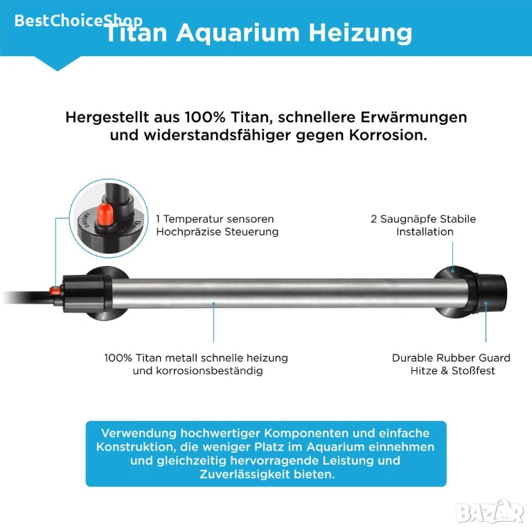 - [Титианов нагревател за аквариум] Нагревателят е изработен от здрав титан, водата се загрява по-бързо и е напълно нечуплив, тъй като конструкцията му не съдържа стъкло. Подходящ за солени и сладководни аквариуми от 150 до 220 литра.