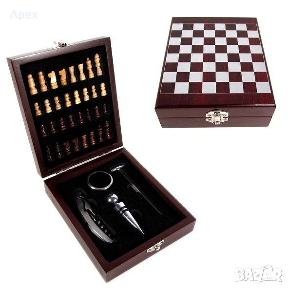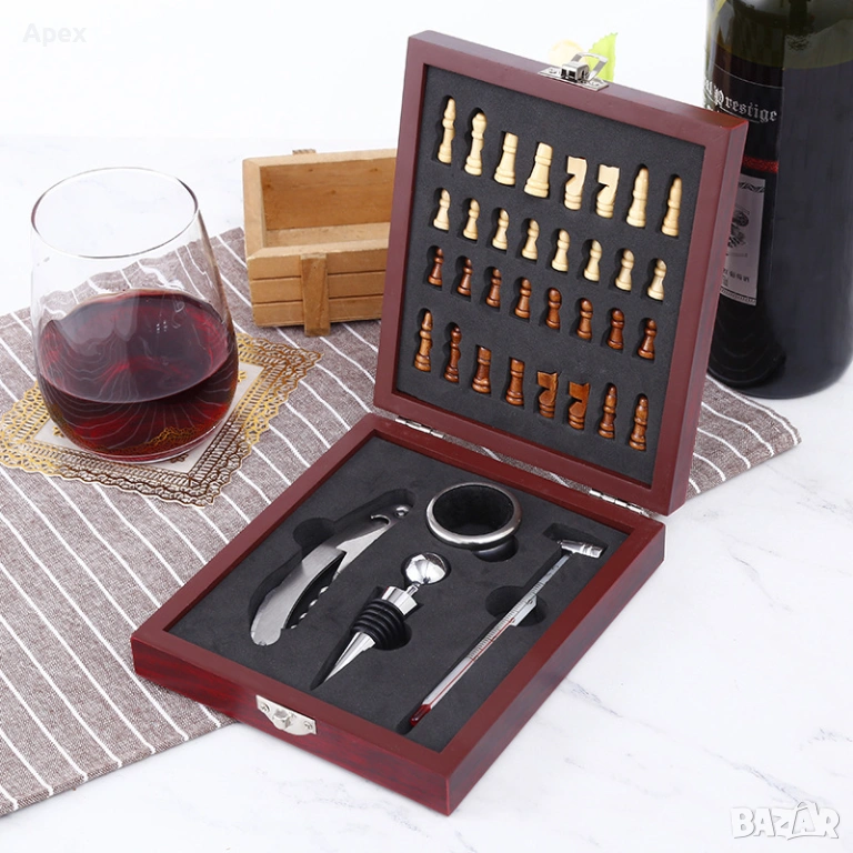 Луксозен Сет за Вино и Шах в Дървена Кутия с Аксесоари. Цена-15 €