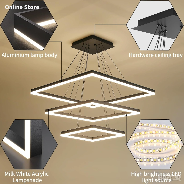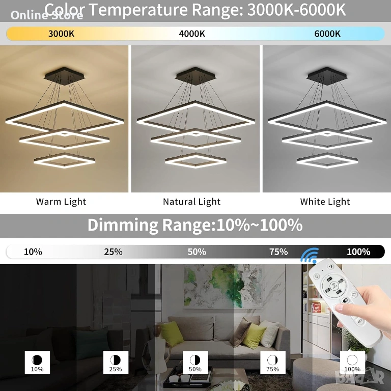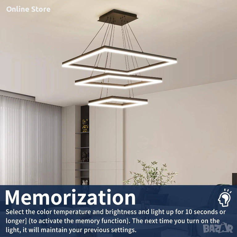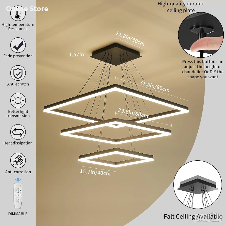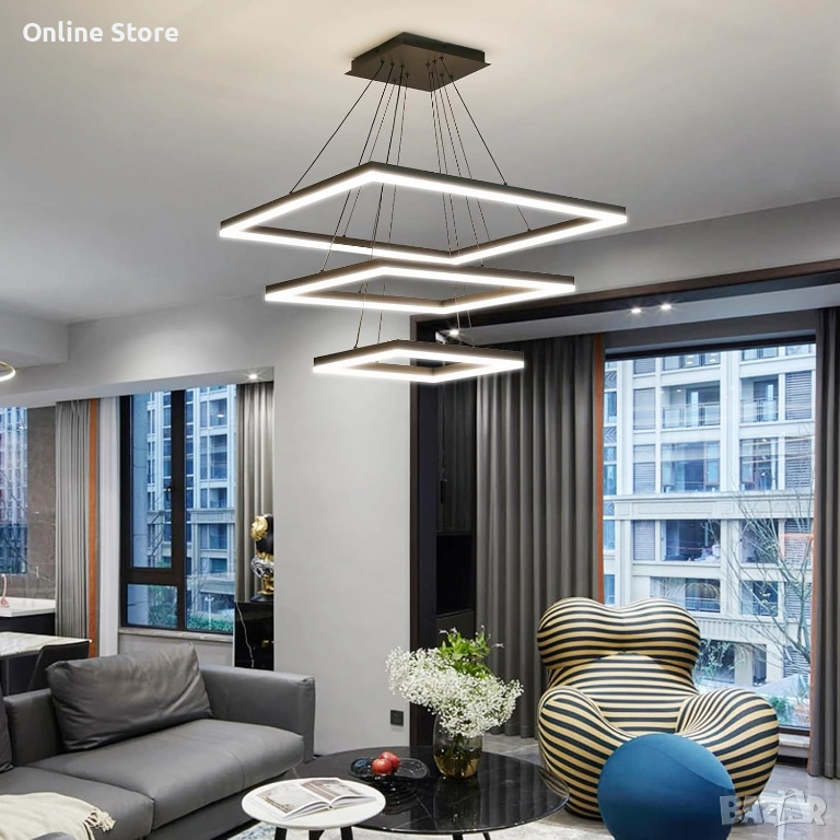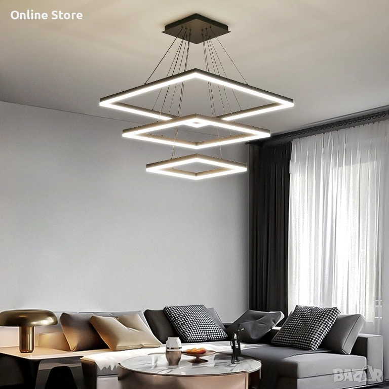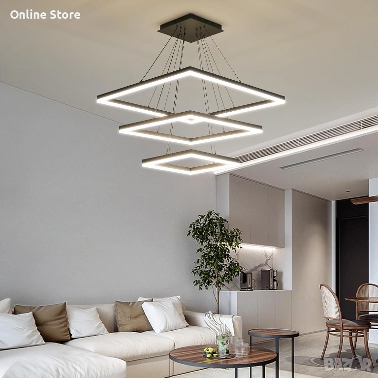 Стилен LED полилей с модерен 3-слоен квадратен дизайн, който придава завършен и елегантен вид на всяко помещение. Подходящ е за хол, трапезария, кухня, спалня или офис, като съчетава красива визия, приятна светлина и удобен контрол според настроението и нуждите ви. Регулируемата височина позволява лесно напасване към различни тавани и интериори.