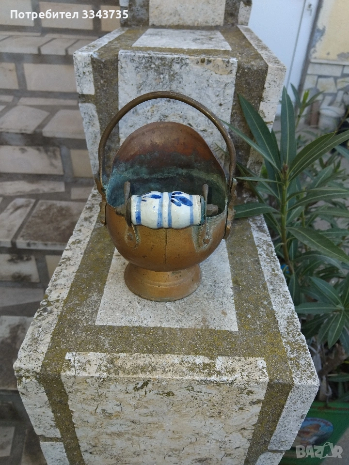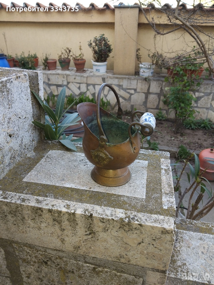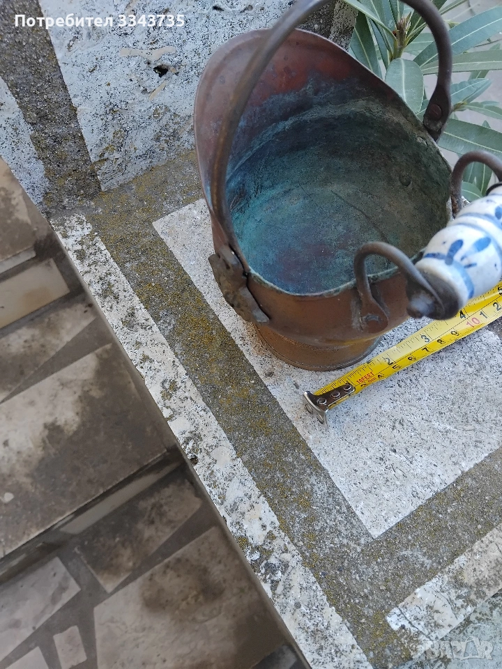 Това е античен меден,декоративен за въглища известен още като "кофа за въглища"или"scutte"Изработен е от мед с дръжка,която вероятно е от месинг и керамика(с делфтски мотив).При интерес пишете или се обадете.Възможен е лек коментар върху цената.