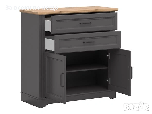 Модулната система за обзавеждане TOLMIN е перфектният избор за тези, които очакват не само стил, но и практичност от своите мебели. Комбинацията от графитен корпус и плот от занаятчийски дъб създава модерен ефект, който ще изглежда страхотно както в класически, така и в съвременен интериор. Скрин Tolmin съчетава практичност с изискана естетика – всеки ден ще започне с ред и хармония във вашия интериор. Той предлага разнообразни възможности за съхранение. Вратите скриват по-големи предмети, докато чекмеджетата побират по-малки предмети, които искате да държите под ръка. Всяка мебел има свое собствено обособено място.
