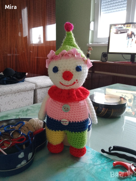 Плетена на ръка кукла-клоун.От естествени материали.