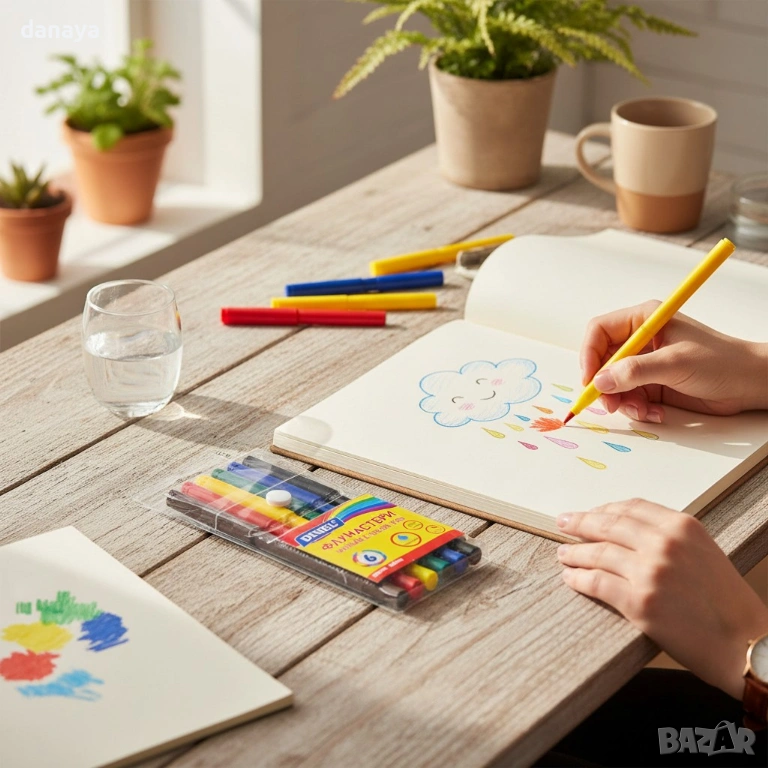 Комплектът от 6 основни цвята е напълно достатъчен за първите детски рисунки, оцветяване на книжки и училищни задачи. Удобната форма на флумастерите позволява лесно захващане от малки ръчички, което прави рисуването приятно и без усилие.