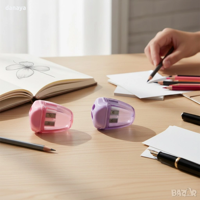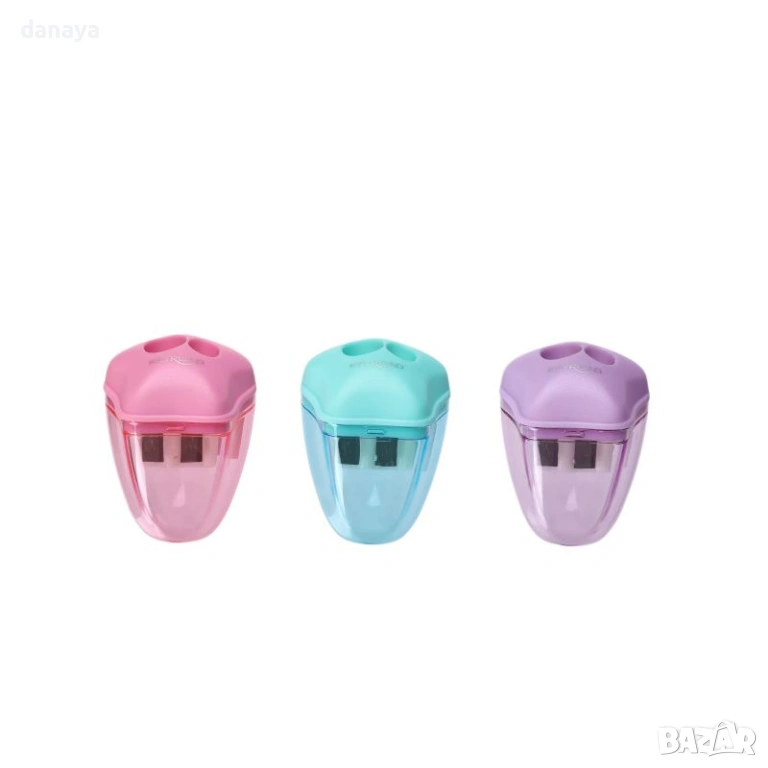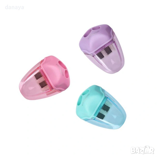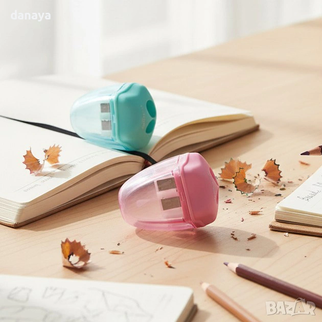 Двойната острилка позволява използване както за стандартни, така и за по-дебели моливи, което я прави универсален избор за ученици. Остриетата подострят гладко и равномерно, без да чупят графита, а компактният размер и заоблен дизайн я правят удобна за малки ръце.