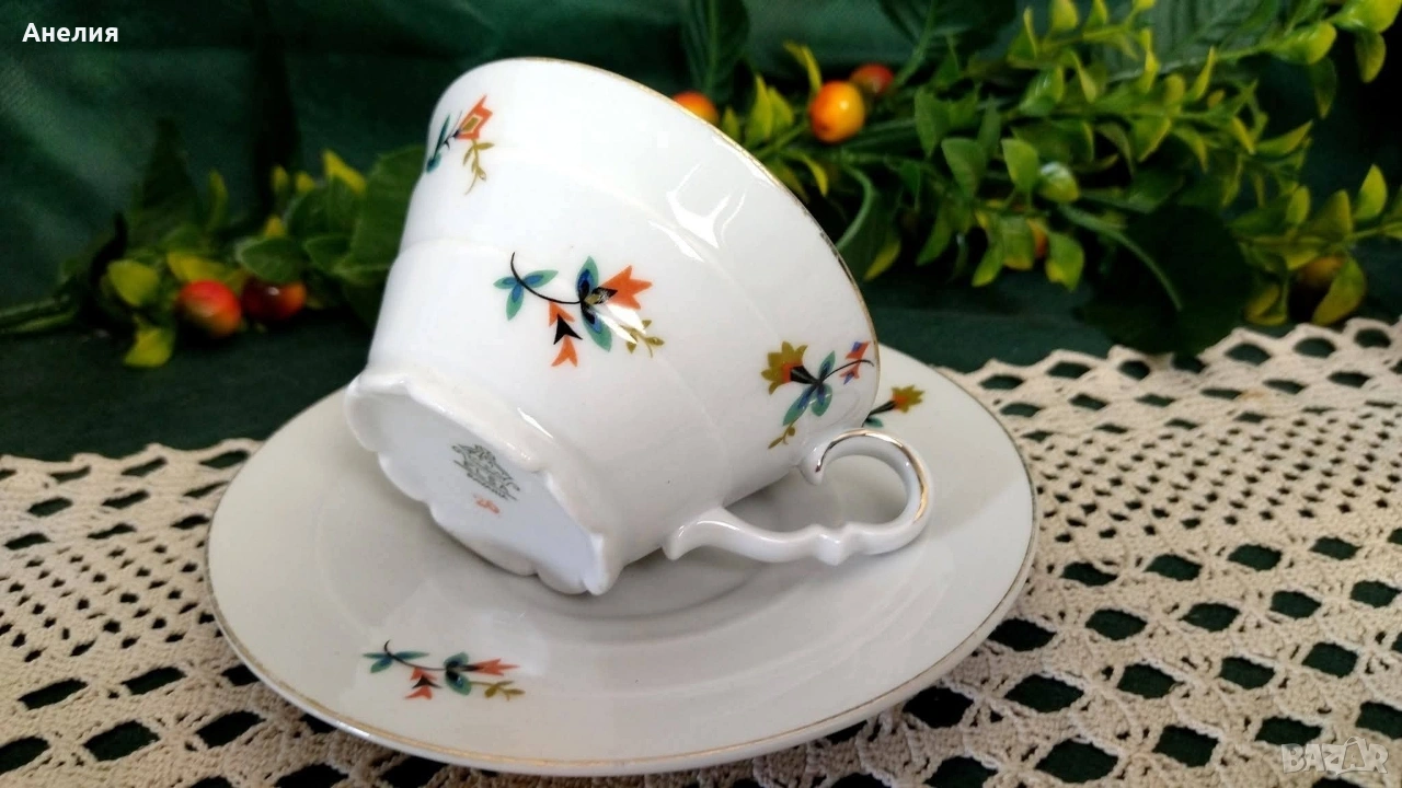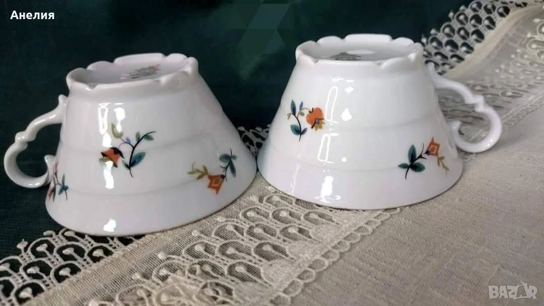 Чудесни,свежи с чашки с релеф на етажи.Порцелан от 60 те години.Мноого леко изсветляване на места по канта.