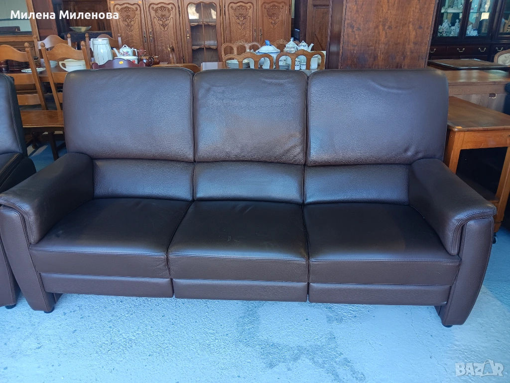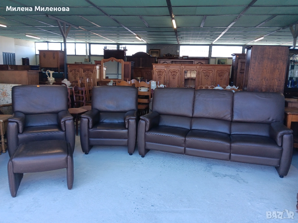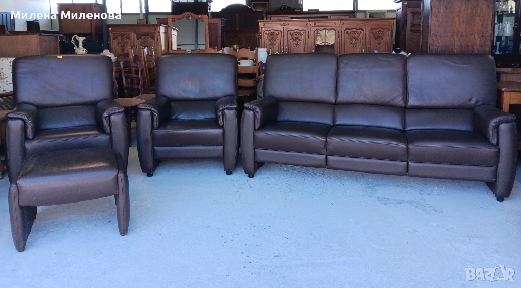 Внос от Белгия, естествена кожа, диван тройка, два фотьойла и табуретка.