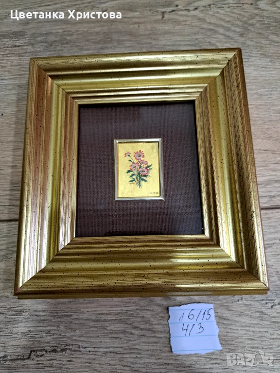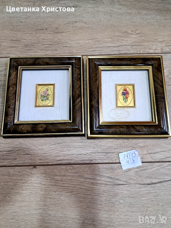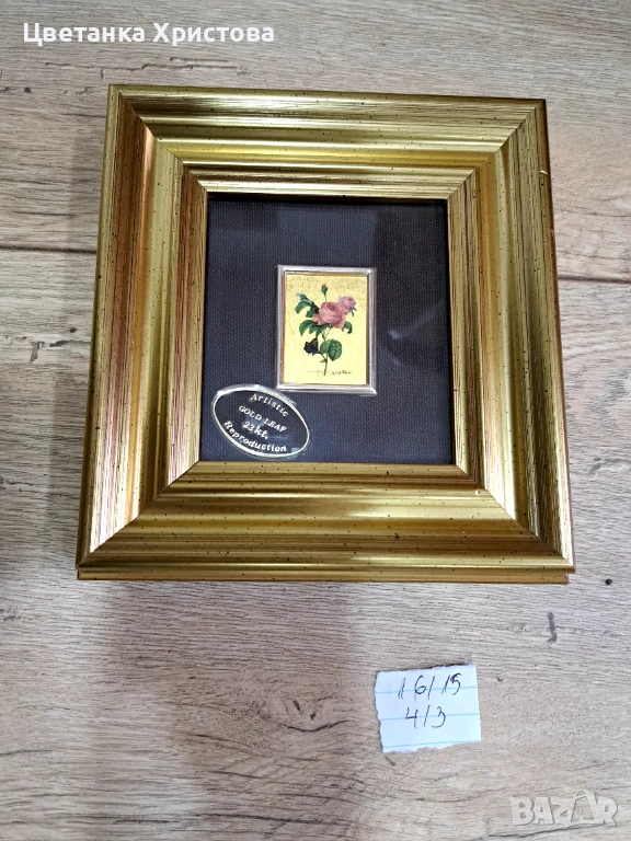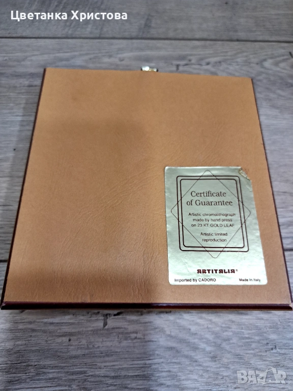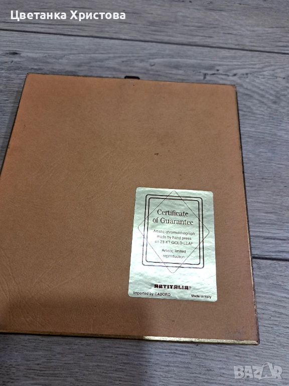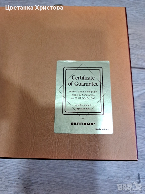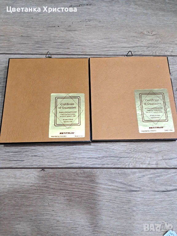 Пет картини колекционерска арт репродукция, изработена от италианската компания Artitalia, със сертификат за гарантиране, че е художествена хромолитография, направена на ръчна преса върху 23 - карстово златно фолио. Художествена ограничена репродукция. 25 € е цената за една картина.