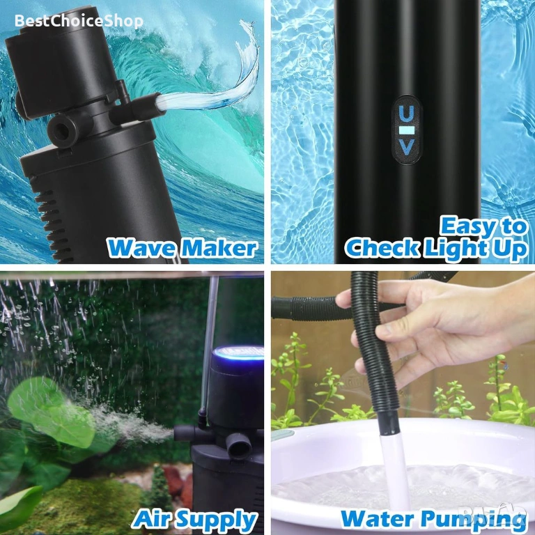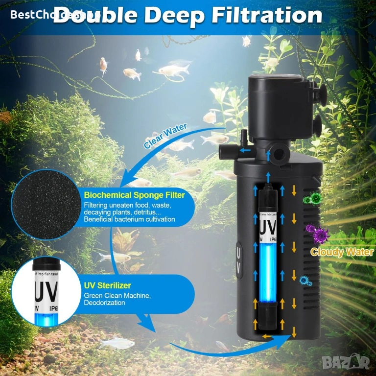 - 【Двойна система за филтриране】Комбинира биохимична гъба (механична филтрация) и 254nm UV лампа за по-чиста вода без мирис