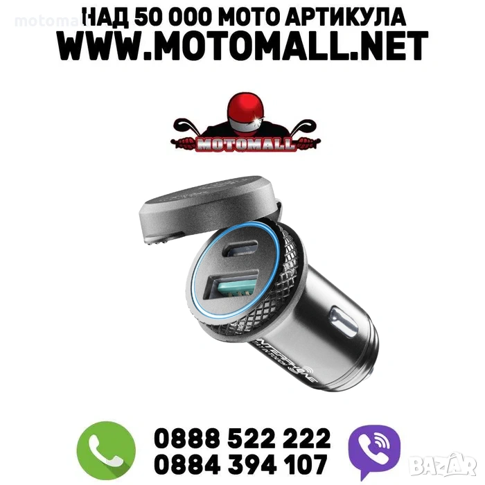 12 V адаптер за гнездо „запалка“, оборудван с два USB порта – Type-A и Type-C. Позволява едновременно зареждане на две електронни устройства чрез кабел за зареждане.
