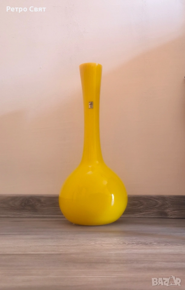 Модернистична стъклена ваза от жълто дебело стенно стъкло на фабрика "Лебед" Нови пазар. Вазата е стабилна и не много тежка, напълно здрава, без отчупване. Висока-48cm. Вази като тази все още се използват за декорация на жилища в съвременния дизайн. Цената не подлежи на коментар!
