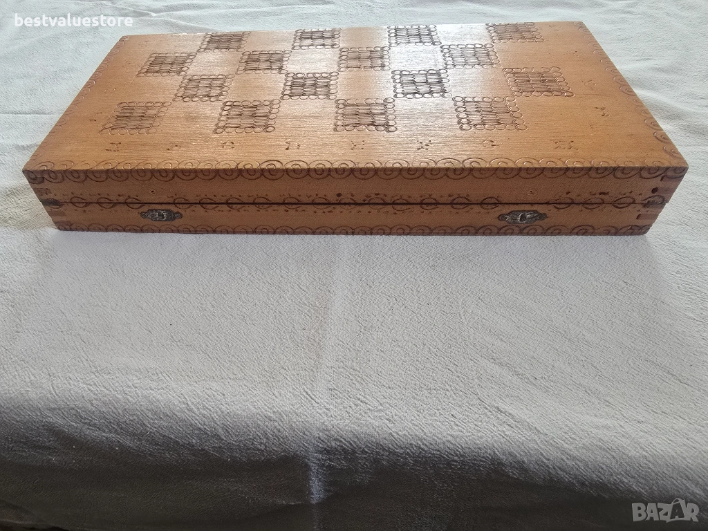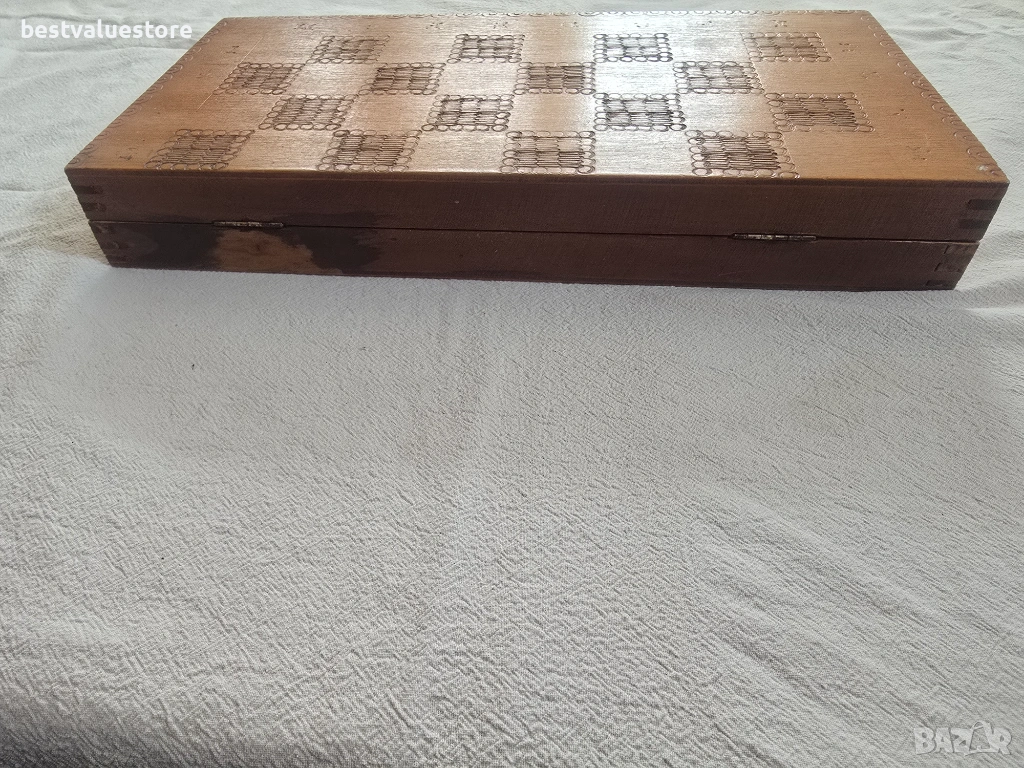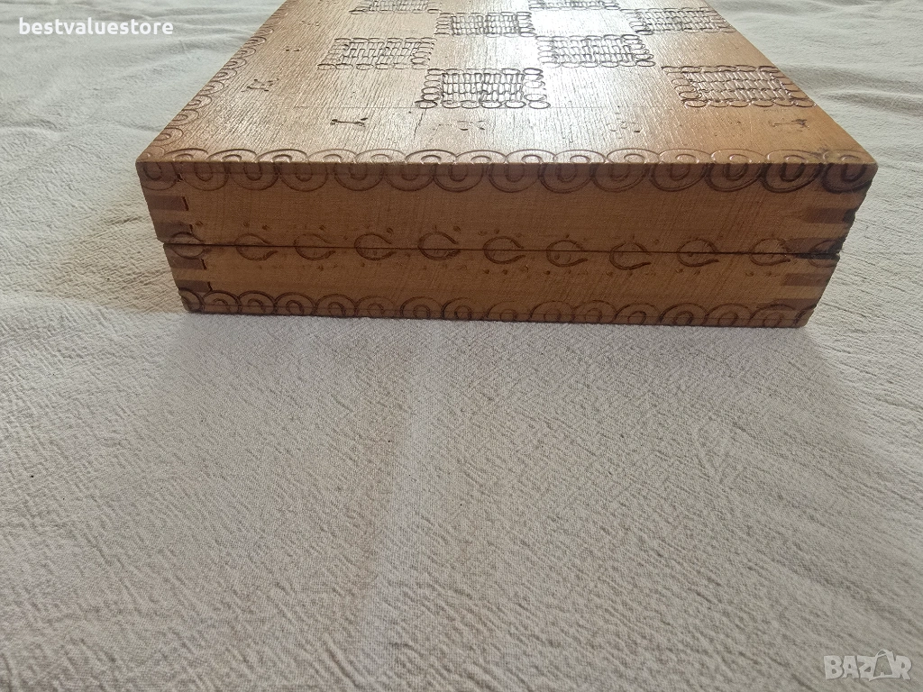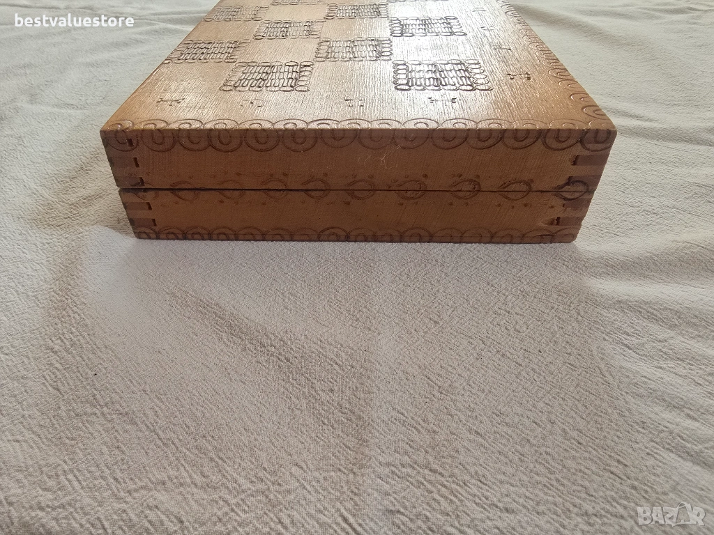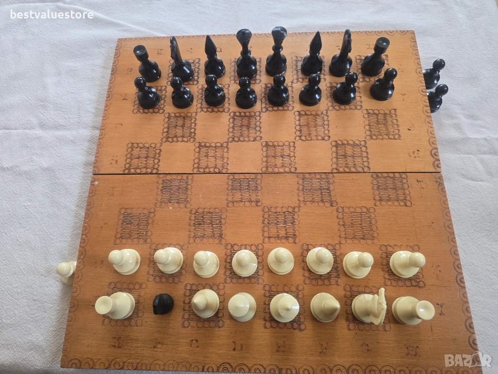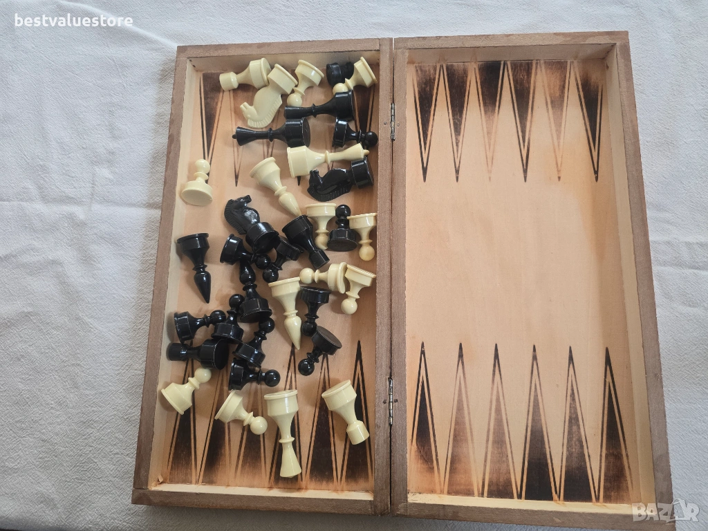Куките за затваряне на кутията липсват. С пластмасови фигури, един бял кон липсва, има малък черен кон вместо него. Има и 3 допълнителни пешки. Размер на кутията: 34.5-34 см.