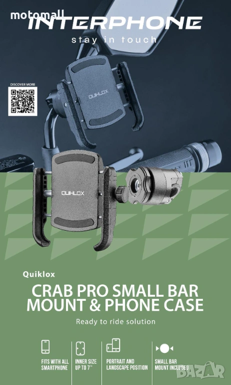Комплектът Quiklox Crab Pro представлява версия на известната стойка Interphone Crab с интегрирана система за закрепване Quiklox. Бързото поставяне и сваляне позволява лесно боравене със смартфона, дори когато е с калъф, както и удобно използване на тъчскрийна.
