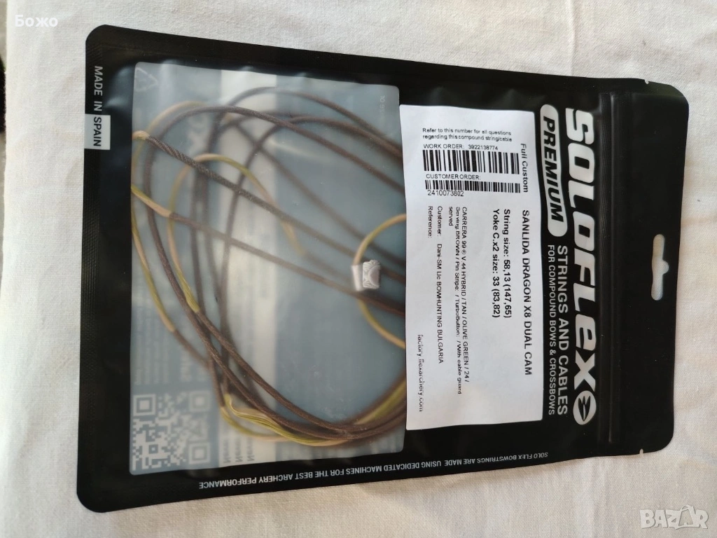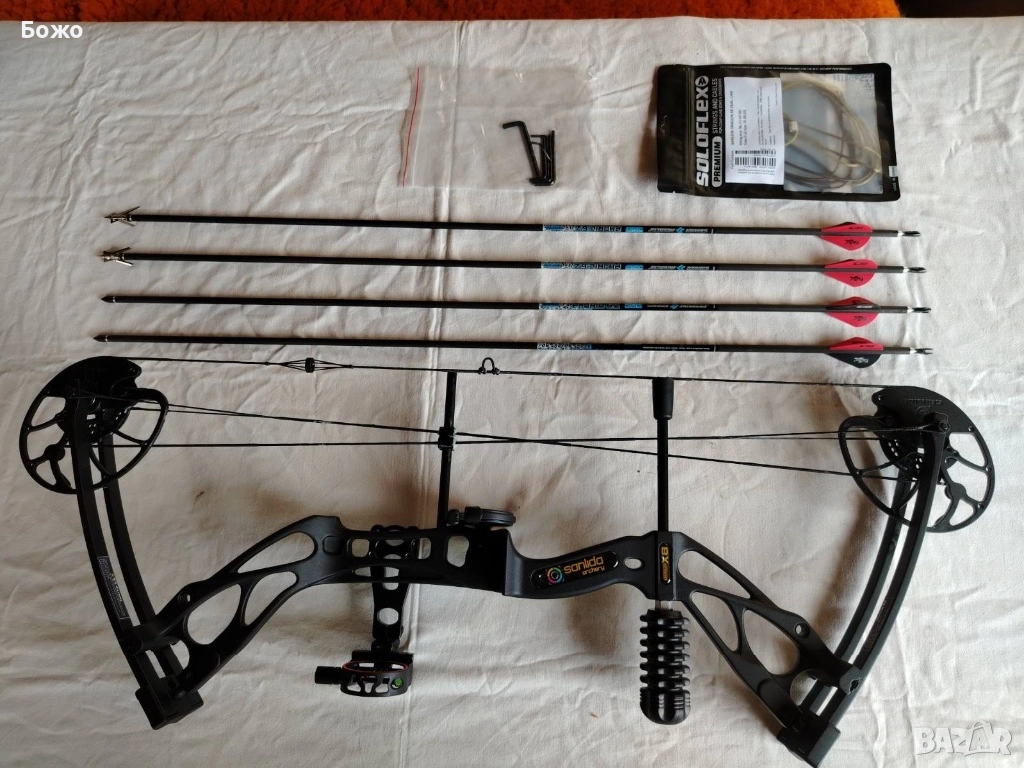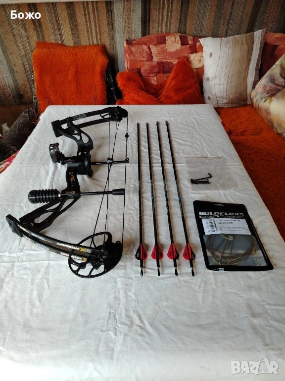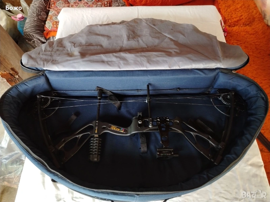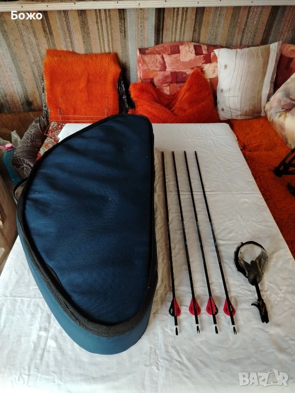 Имам налични още тапициран калъф-куфар с множество отделения, който може да се носи и на рамо, спусък за лък и още четири броя стрели от чист карбон, заедно с резервни стабилизатори. Куфарът и спусъкът не са нови и са използвани, но са в пълна изправност. Цената на този допълнителен пакет е 50 евро и се закупува по желание.