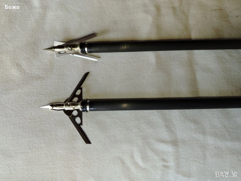 На купувача, освен лъка ще предложа като бонус пълен комплект тетива и кабели, които са испанско производство и са чисто нови и също така четири броя карбонови стрели. Ще му подаря и два броя ловни върхове, модел “RAGE Hypodermic”, които летят затворени, а при удар в целта се разтварят и правят разрез от пет сантиметра. (Има ги на снимка в двете състояния). Към лъка има и оригинални ключове-шестограми.