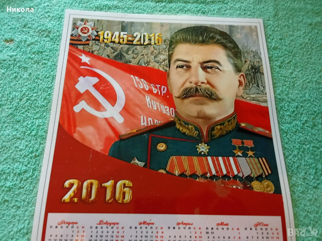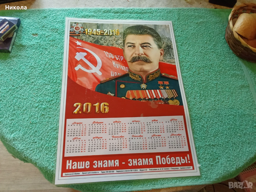 Винтидж календар на Йосиф Сталин, Русия, печат 2014 г, издаден по случай 70-та годишнина от победата във Великата отечествена война. Размер, 42х30 см, ламиниран. В много добро състояние, без скъсвания и драскотини. В момента не се предлага в мрежата в страната и чужбина, извън Русия, където предлагането е ограничено. Чудесен за фенове, колекция или подарък.