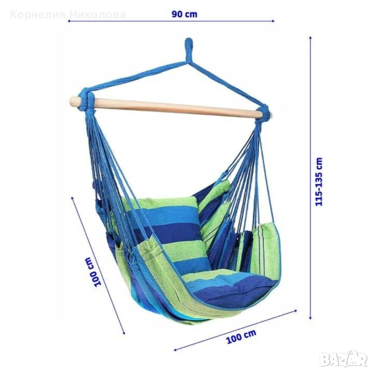 Голяма хамак с въжета. Издържливост до 150 кг. Подходящ за ПРОМОЦИЯ - Голям хамак с въжета. Издръжливост до 150 кг. Подходящ за градина, веранда, тераса и дом. Хамак и стол 2в1. Комплектът включва 1 бр. хамак стол с въже + дървена пръчка. Цвят - Вар.1 (синьо със зелено), Вар.2 (червено, жълто, оранжево зелено). В комплекта няма възглавница! "Зелено , Червено "