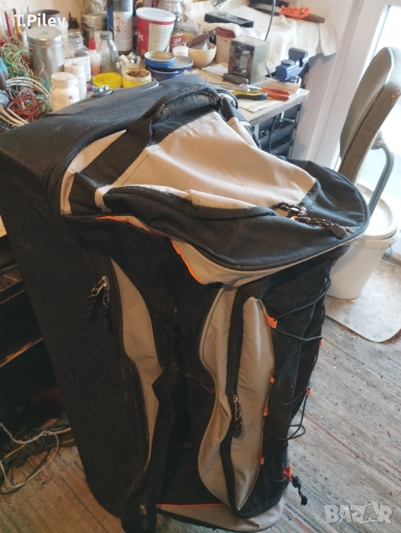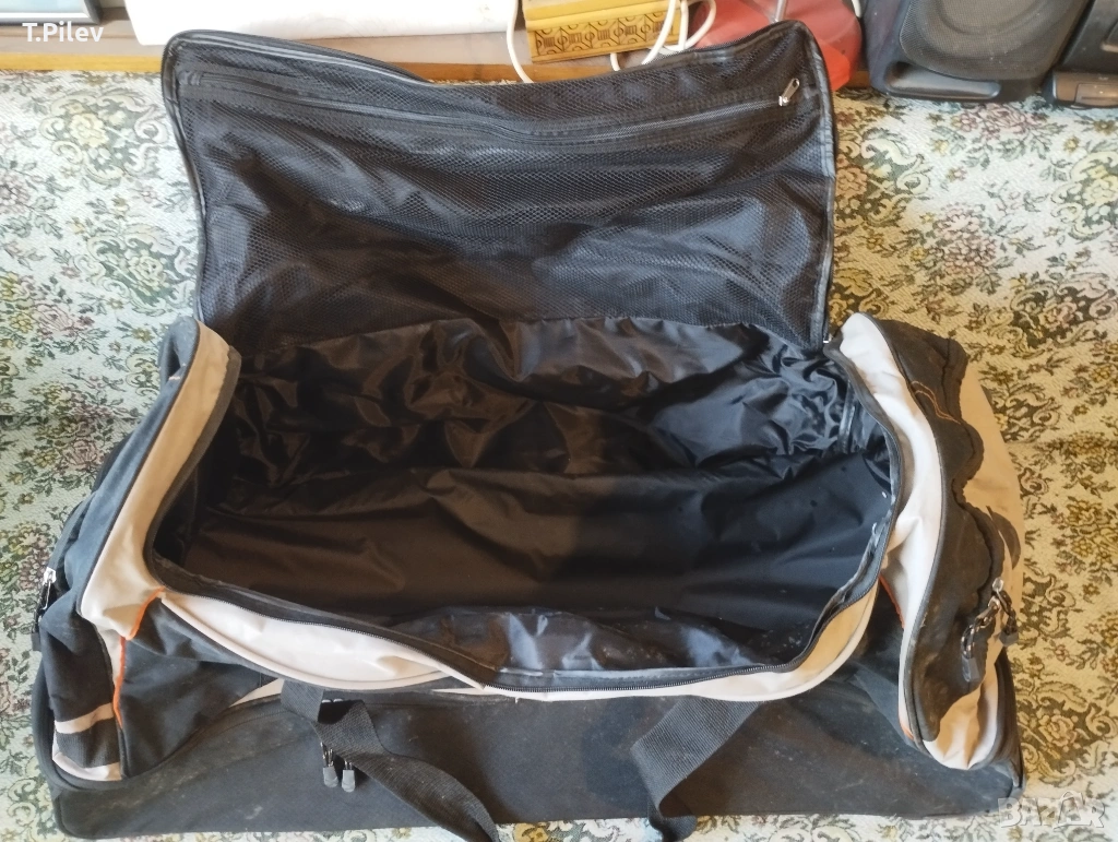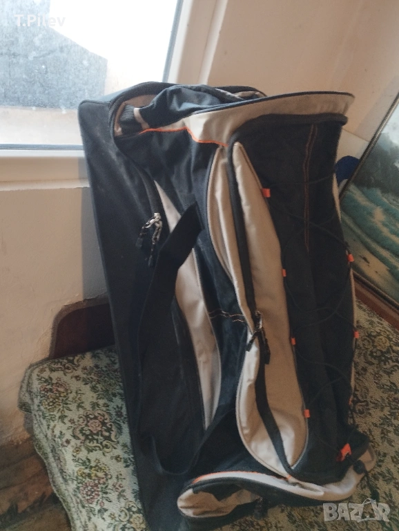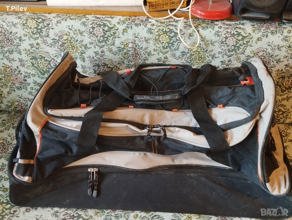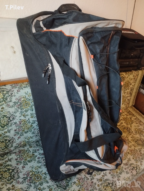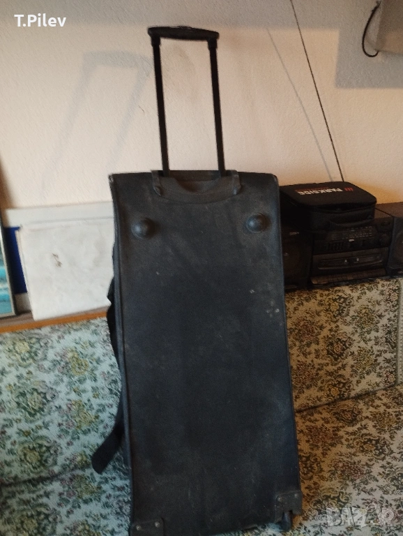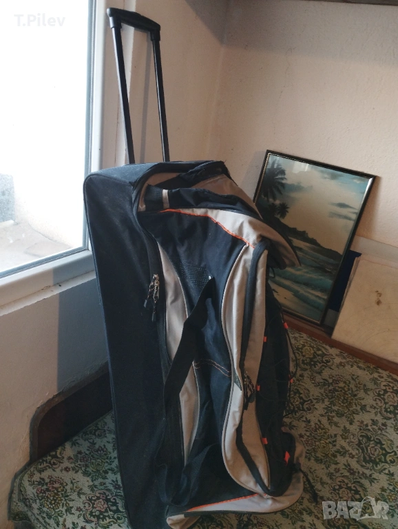 на колелца. Размери 90х40х40 см.Отвътре е чист, със здрави ципове. Външно