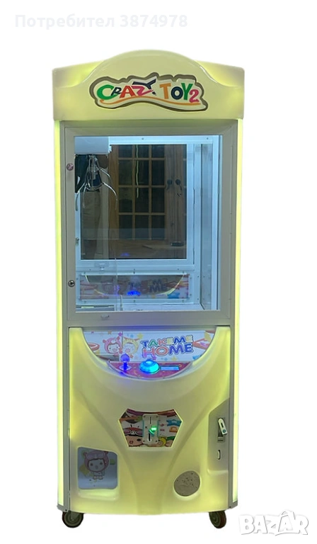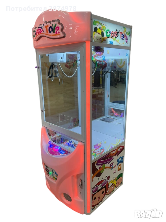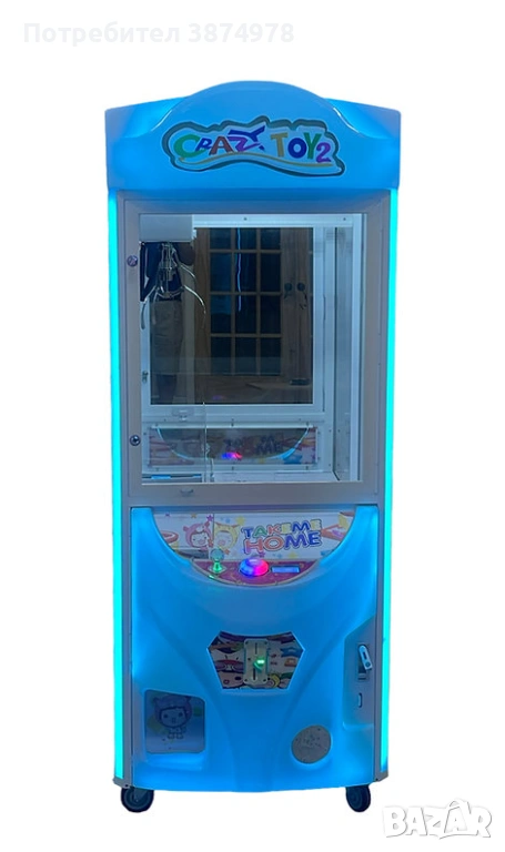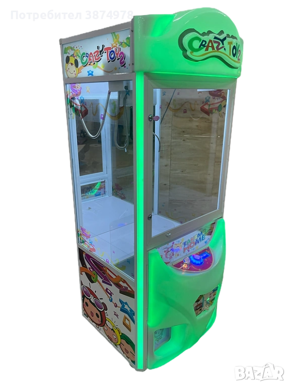 кран за ловене на играчки от деца, тийнеджъри и за възрастни. Машина - кран за плюшени играчки на житони работи с евро центове или житони. Този машина е за ловене на плюшени играчки от най-ново поколение. Играта е с изключително атрактивен външен вид, осветление сменящо цветовете си , прекрасен пулт за управлениe , включващ светещ джойстик , светещ бутон и дисплей течен кристал.