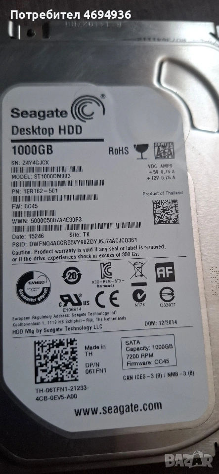 HDD segate 1000GB на 7200Rpm. → Обява 54178756