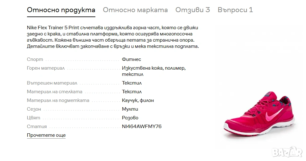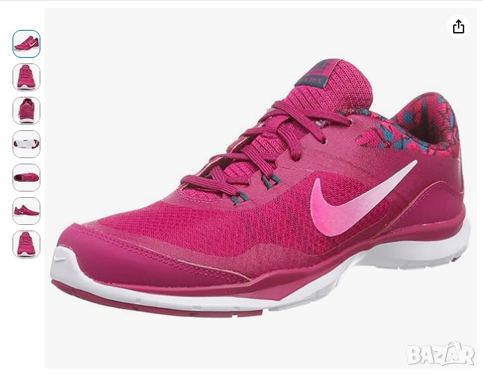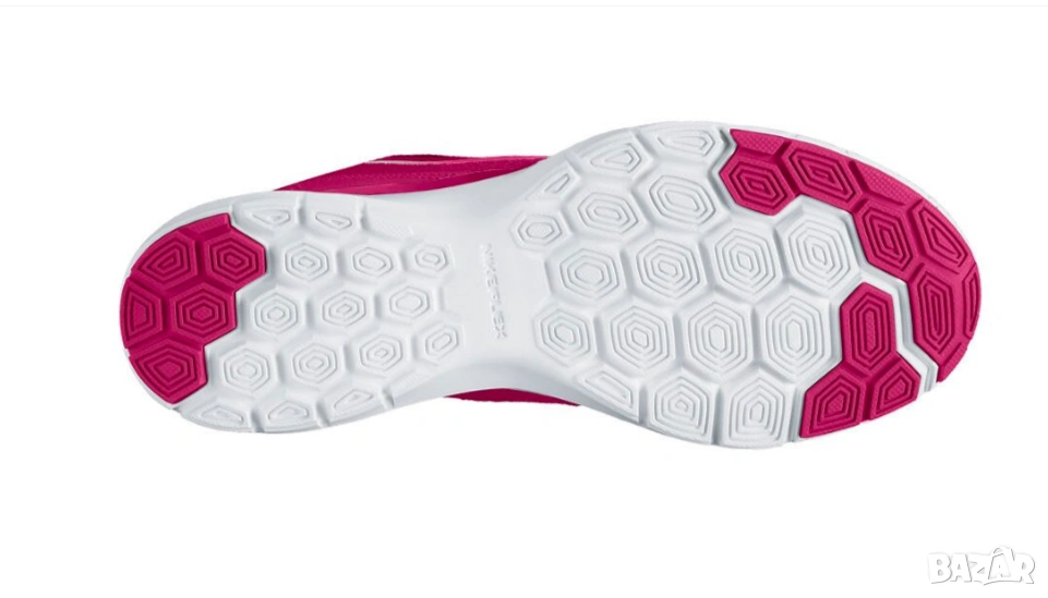 Nike Flex Trainer 5 (често наричани и Flex TR 5), в цветова комбинация "Sport Fuchsia/White/Vivid Pink". Моделът е предназначен за тренировки и съчетава дишаща мрежеста горна част с гъвкава подметка, осигуряваща стабилност при различни упражнения.